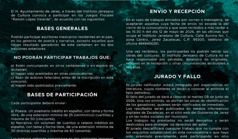 Ver más Invitan a escritoras y escritores mexicanos a participar en los Juegos Florales “Ramón López Velarde” 2026Recuperan cuerpo por ahogamiento en Jerez
