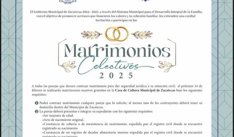 LA CAPITAL DE ZACATECAS FACILITA EL CAMINO HACIA EL MATRIMONIO CIVIL * Los Matrimonios colectivos 2025 se realizarán el 14 de febrero en la Casa…