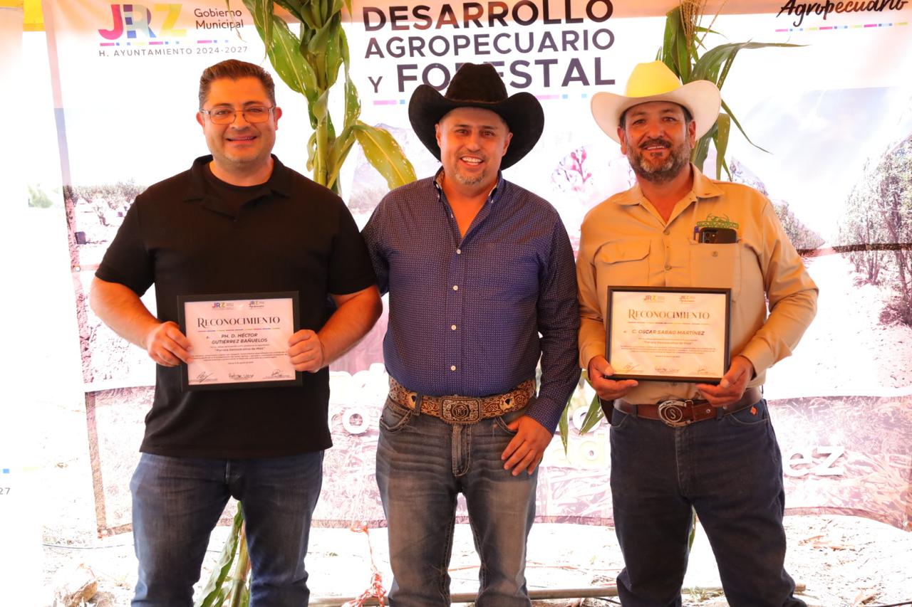 Rodrigo Ureño, acompañado del titular del Desarrollo Agropecuario y Forestal, Rolando Ruiz Vázquez, entregó reconocimientos a los ponentes Oscar Sabag Martínez, Héctor Gutiérrez Bañuelos y Ricardo Alonso Sánchez Gutiérrez; por sus participaciones en el evento.