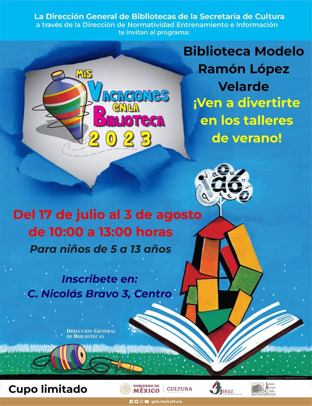 Jerez, Zac.-La Biblioteca Modelo “Ramón López Velarde” y las otras 10 bibliotecas que se encuentran en la cabecera municipal y en las comunidades, invitan a padres, madres e hijos a que se inscriban al curso de verano “Mis vacaciones en la biblioteca 2023”. Este curso está dirigido a niños de 5 a 13 años y se realizará del 17 de julio al 3 de agosto, con el objetivo de fomentar la lectura entre la infancia jerezana, como parte de las acciones del gobierno municipal 2021-2024. Los talleres son coordinados por la Dirección General de Bibliotecas del gobierno federal y son totalmente gratuitos.