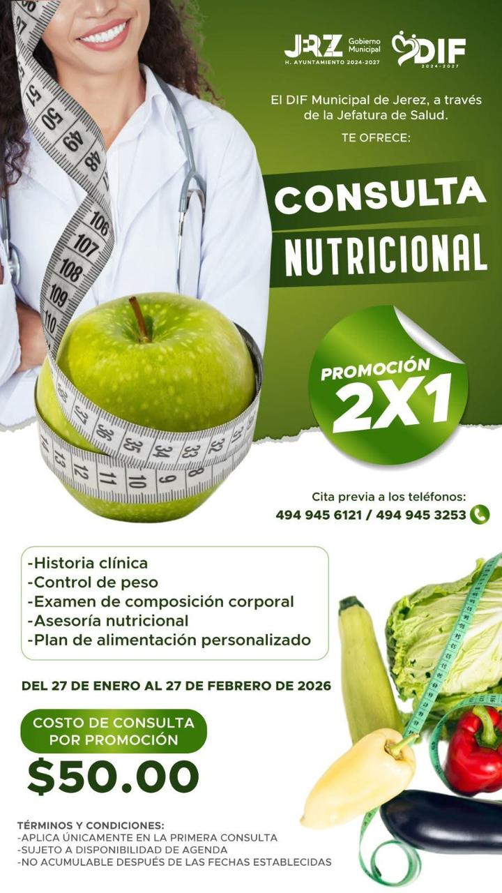Para celebrar el Día del Nutriólogo, en el DIF de Jerez estaremos ofreciendo hasta el 27 de febrero consultas nutricionales al 2×1 en la primera cita por un costo promocional de $50, para que tú y un acompañante conozcan su estado de salud nutricional.
