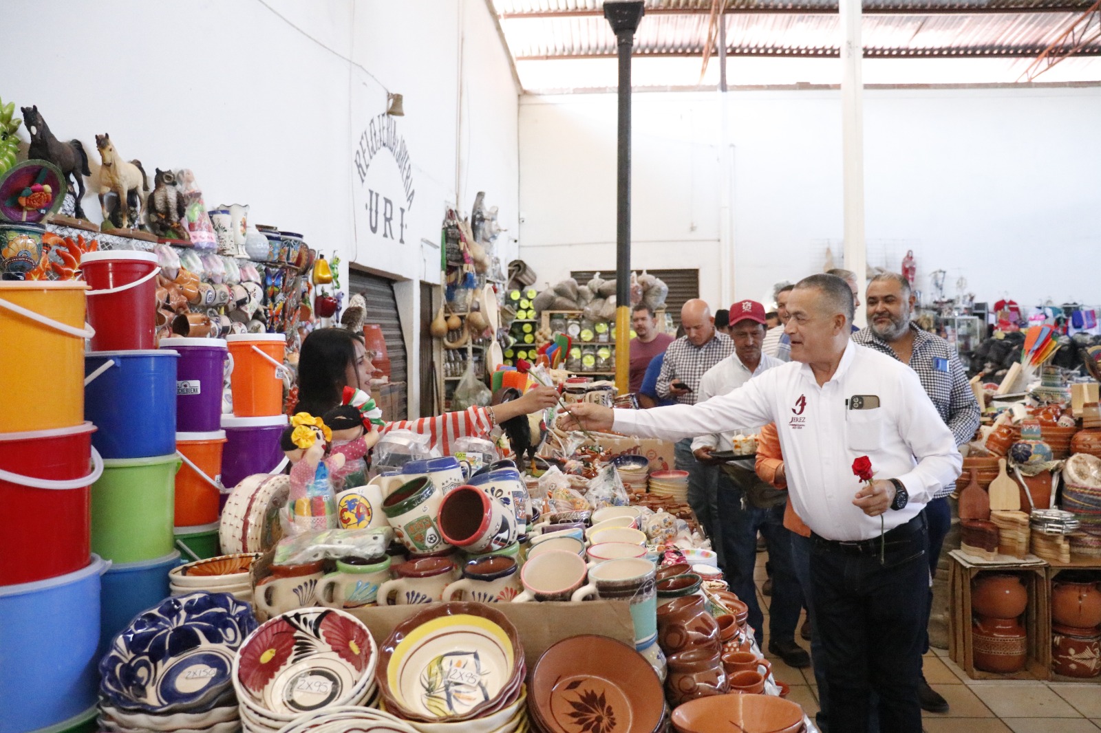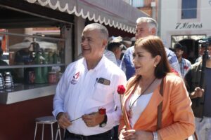 Jerez, Zac.-El alcalde José Humberto Salazar Contreras y su esposa la presidenta honorífica del DIF Bertha Alicia García Duarte celebraron a las madres locatarias del mercado Benito Juárez, así como a trabajadoras del mismo y mamás que, la mañana de este 10 de mayo, realizaban alguna compra en el lugar.