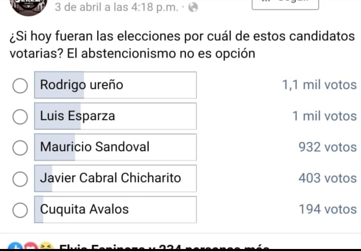 El candidato del pueblo Rodrigo Ureño, ganó la primera encuesta en Facebook, con 1444 votos los cuales representan el 30% de los votantes, la popularidad de Ureño va en crecimiento, dejando a sus contrincantes muy lejos de la popularidad social.