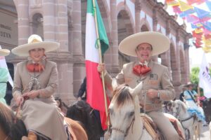 Hoy cabalgamos a su lado para mostrarles cariño, respeto y admiración; rendimos homenaje a su generosidad y arraigo, dijo el doctor Salazar previo al inicio del recorrido que encabezó acompañado de su esposa la presidenta honorífica del DIF Bertha Alicia García Duarte, la regidora Martha Alamillo, migrantes y cabalgantes que iniciaron el recorrido al ritmo de la Marcha de Zacatecas, acompañados por una banda jerezana.