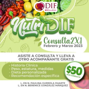 Por tal el DIF Municipal invita a la ciudadanía a formar parte de los esfuerzos de concientización, acudiendo a revisar sus hábitos alimenticios mediante esta promoción de atención gratuita 2×1 en la primer consulta, que será válida hasta finalizar marzo.