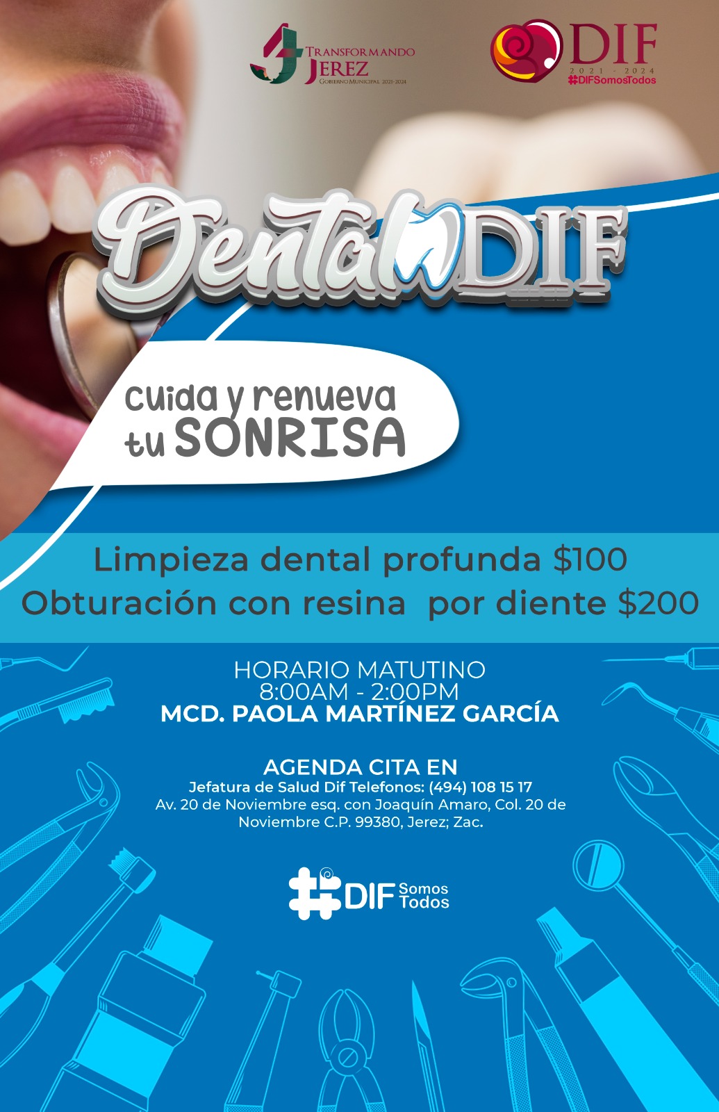El DIF de Jerez continúa ofreciendo a la ciudadanía atención en salud bucodental, con promociones y descuentos importantes en limpieza profunda y relleno de resina.