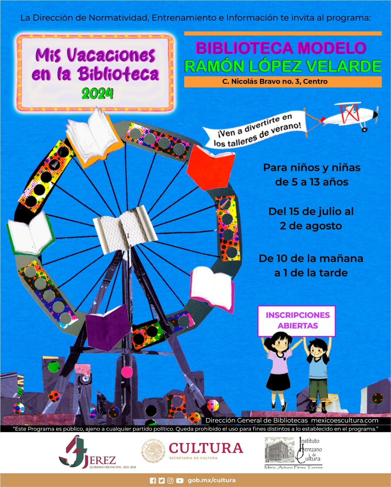 Los talleres se realizarán de lunes a viernes, con horario de 10:00 a 13:00 horas. Todas las actividades son completamente gratuitas y las inscripciones están abiertas desde esta fecha, en horarios de servicio, tanto en la biblioteca modelo Ramón López Velarde, ubicada en calle Nicolás Bravo número 3, como en todos los centros bibliotecarios de colonias y comunidades del municipio.