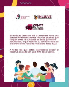 Convencidos de que la experiencia laboral es un recurso muy valioso, el Ayuntamiento de Jerez, a través de su Instituto Jerezano de la Juventud INJUVE, lanzó la convocatoria dirijida a jóvenes estudiantes de 18 a 26 años para participar junto al comité de la Feria de Primavera Jerez en su edición 2022, haciendo su servicio social en el área administrativa donde se estará aportando directamente a la creación y organización de tan representativo evento para el pueblo de Jerez.