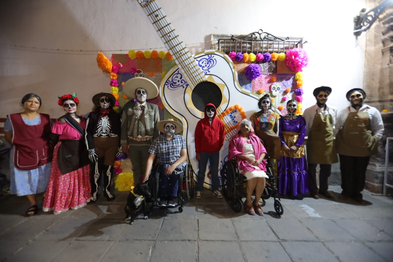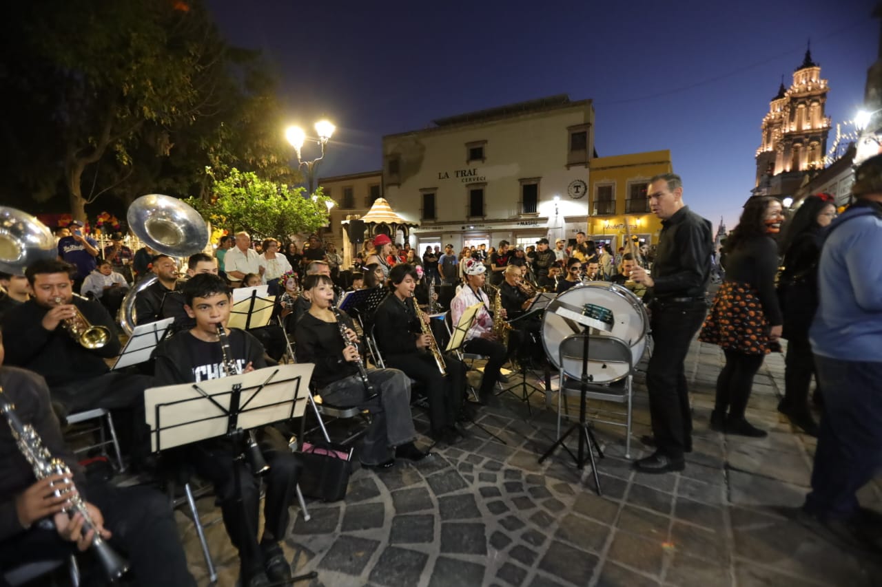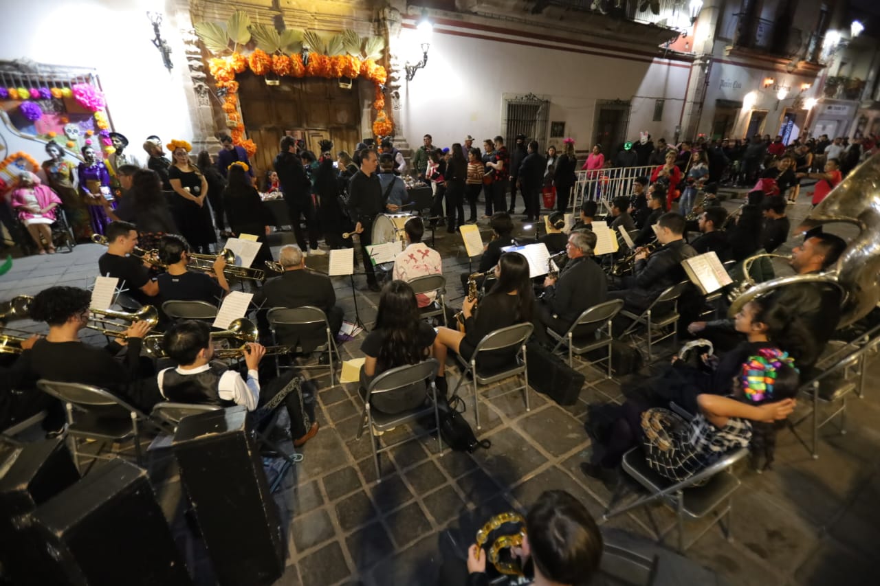 El evento estuvo amenizado por la Banda Municipal de Música»Candelario Huízar», y a la par se montó un escenario que recreó a los personajes de la película «Coco», dando un toque de cultura y alegría al ambiente festivo que prevaleció durante la petición de la ofrenda por parte de la ciudadanía, la cual formó largas filas desde temprano para recibirla.