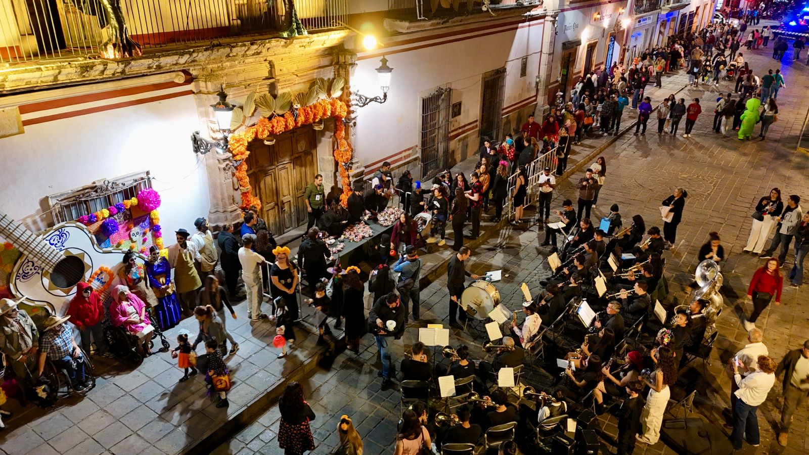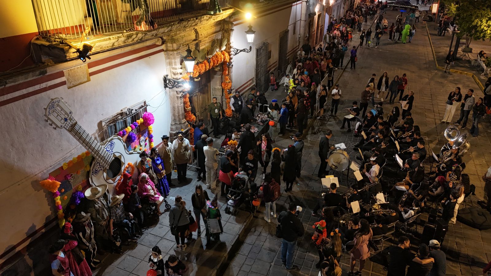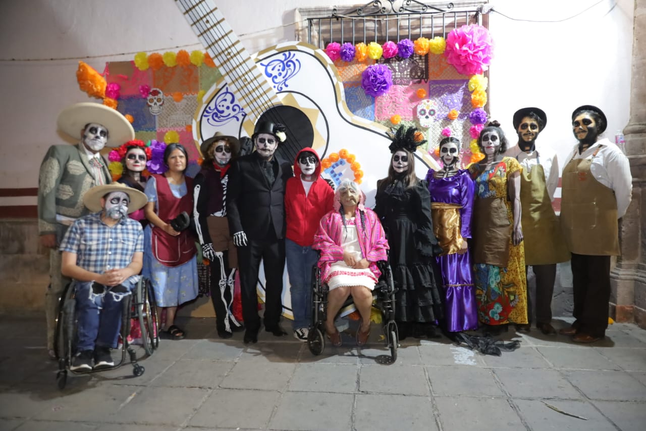 El evento estuvo amenizado por la Banda Municipal de Música»Candelario Huízar», y a la par se montó un escenario que recreó a los personajes de la película «Coco», dando un toque de cultura y alegría al ambiente festivo que prevaleció durante la petición de la ofrenda por parte de la ciudadanía, la cual formó largas filas desde temprano para recibirla.