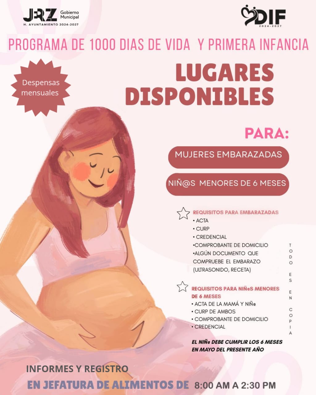 El DIF de Jerez invita a embarazadas o madres con bebés de 0 a 6 meses de edad cumplidos máximo en mayo de este año, a inscribirse al Programa Mil Días de Vida y Primera Infancia, con el que podrán acceder a despensas mensuales durante un año 🤰👶🏻
