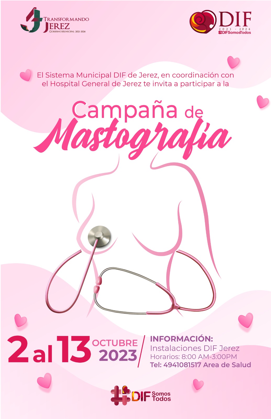 Ocupado en la salud de las mujeres y para conmemorar el Mes Rosa, el DIF Jerez que dirige la presidenta honorífica Bertha Alicia García Duarte, ofrecerá en conjunto con el Hospital General una Campaña de Mastografías gratuitas.