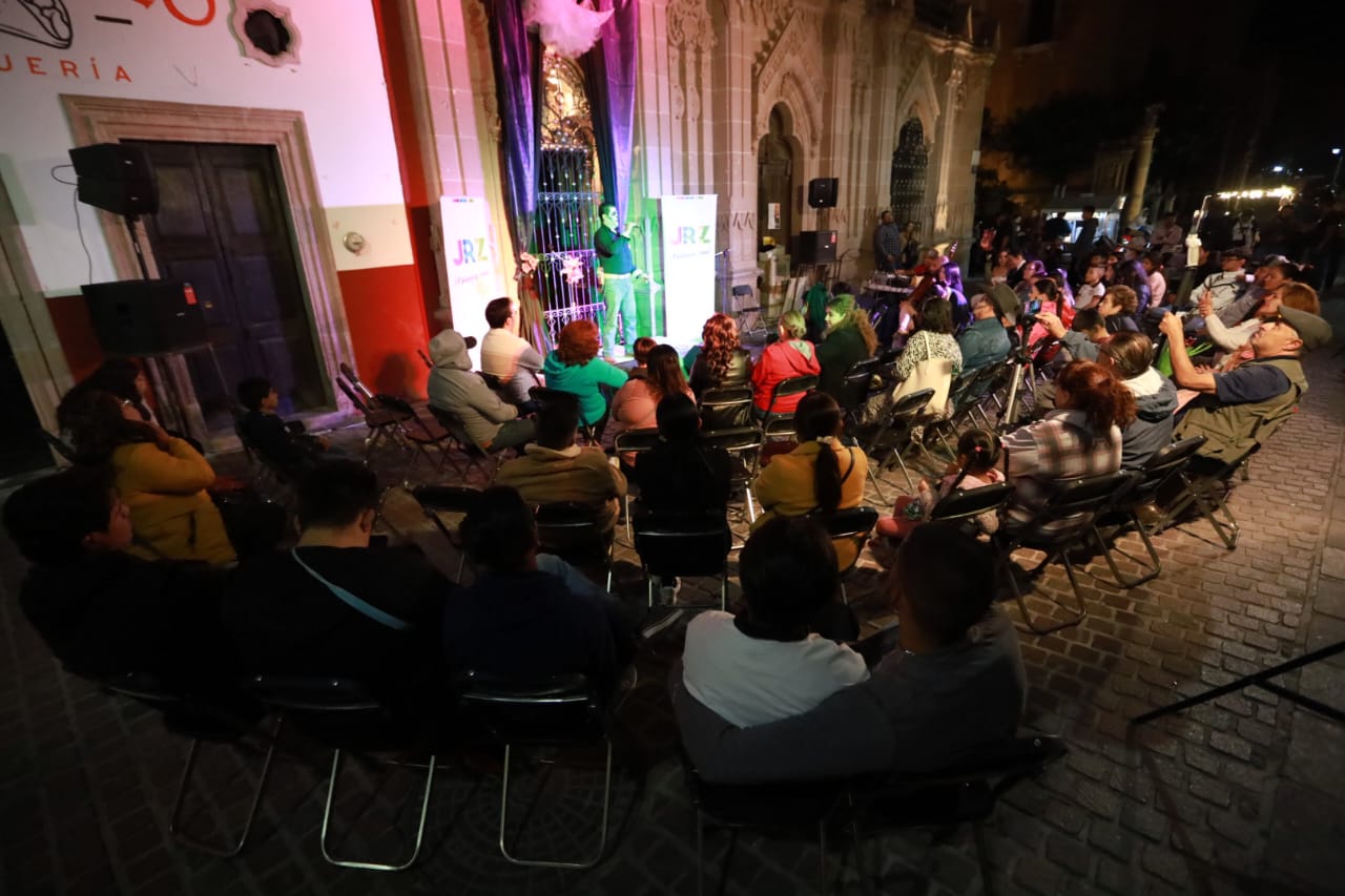 Posteriormente, el Jardín Miguel Hidalgo fue el punto de partida de una de las actividades más esperadas del día: “Leyendas Sobre Ruedas”. Este recorrido a bordo del Turibús permitió a los asistentes sumergirse en las historias del folclore tradicional a través de la narración oral, haciendo paradas en puntos emblemáticos como el Teatro Hinojosa, el Museo Panteón de Dolores y la Casa de Ramón López Velarde.