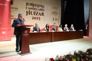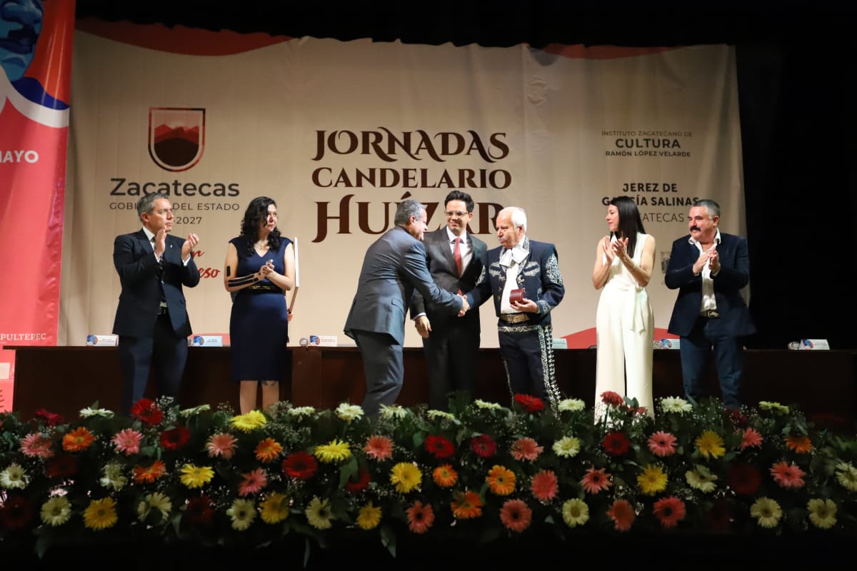 El secretario general de Gobierno, Rodrigo Reyes Muguerza, en representación del gobernador David Monreal Ávila, y el alcalde del municipio, José Humberto Salazar Contreras, encabezaron la entrega de la Medalla al Mérito Musical Candelario Huízar. Este año, el jurado decidió otorgar el premio al músico nochistlense Nicolás Puentes Macías. La ceremonia tuvo lugar en el Teatro Hinojosa, como parte de las jornadas Candelario Huízar 2023. Durante el evento, el funcionario estatal calificó al galardonado como un hombre congruente que siempre está a la altura de las circunstancias. Además, resaltó su labor en la enseñanza, tanto como parte de sus actividades profesionales como en su casa, donde ha contribuido a la formación de varios músicos que actualmente forman parte de diversas agrupaciones de mariachi a nivel nacional.