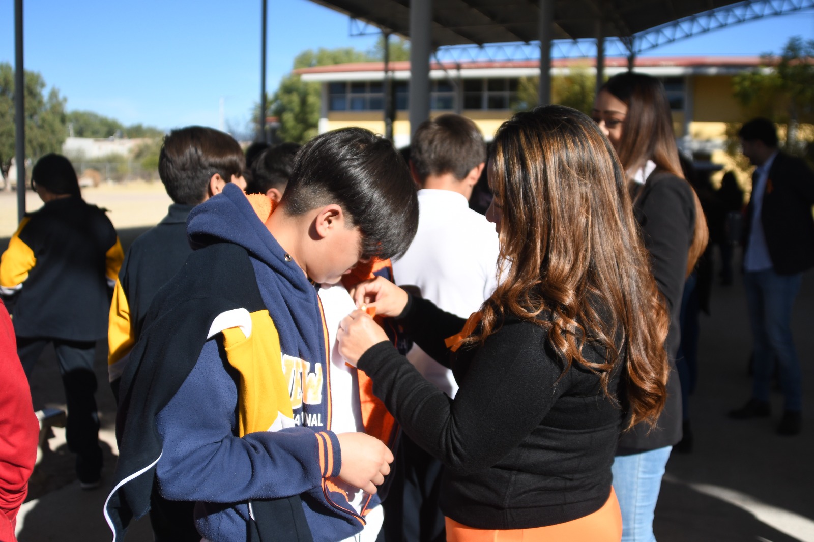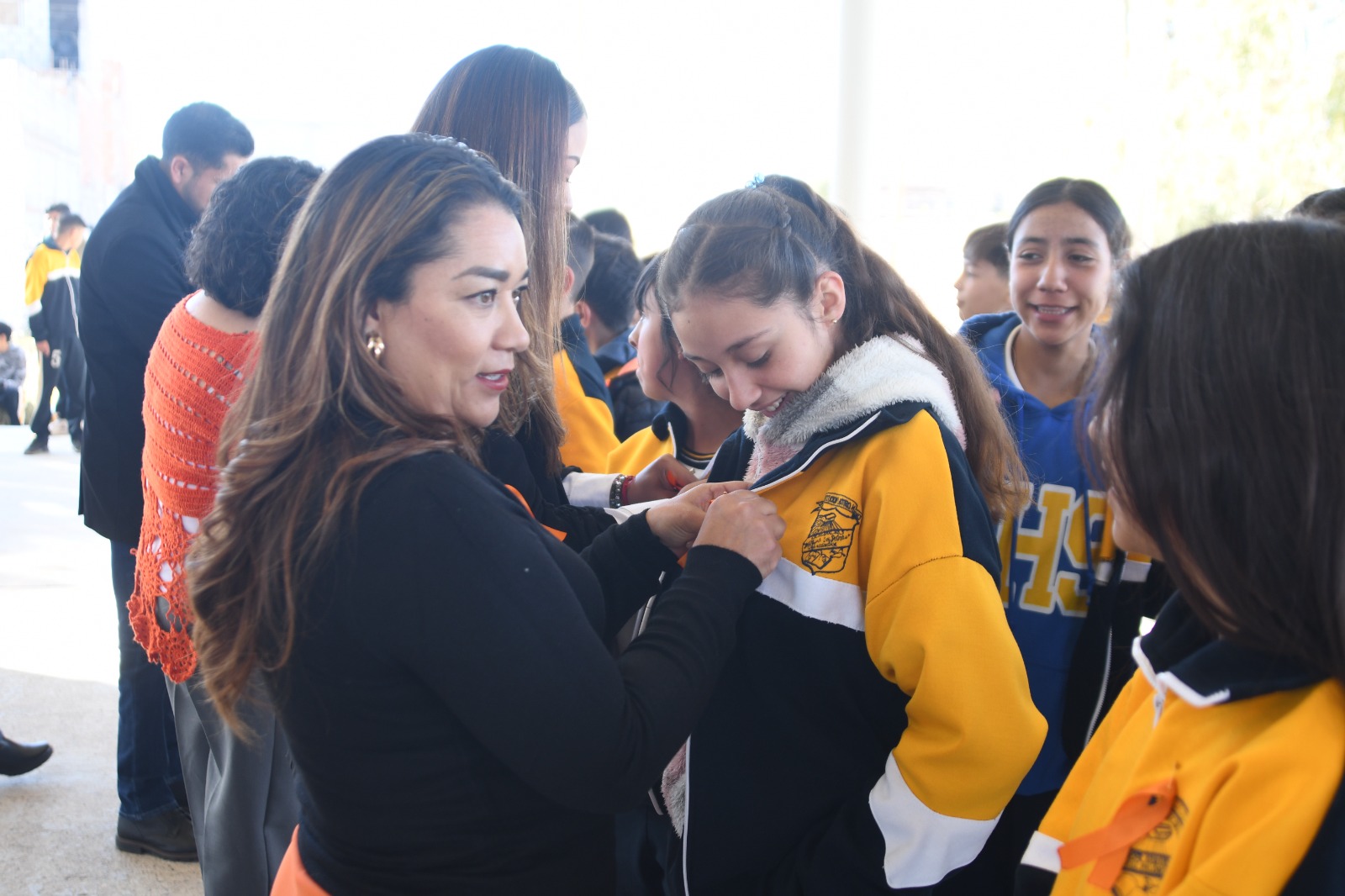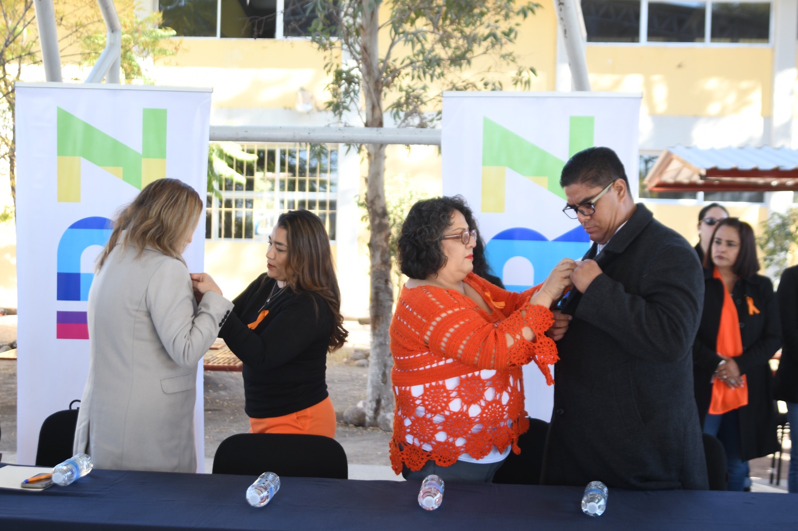Posteriormente, en compañía de la titular del Instituto de la Mujer Jerezana (INMUJE), María Estrada Ulloa, y personal del Sistema, se trasladó a la Presidencia Municipal dando continuidad a la imposición del lazo naranja, símbolo distintivo del movimiento 25N que busca una sociedad libre de violencia de género.