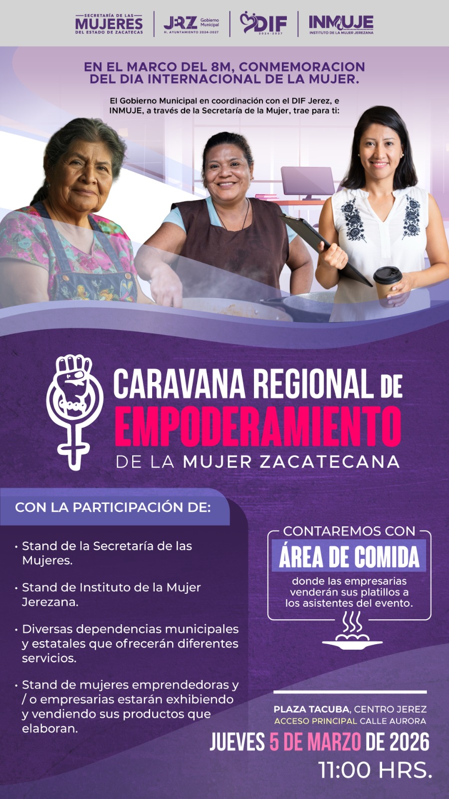 El DIF de Jerez y el Instituto de la Mujer Jerezana (INMUJE), en coordinación con la Secretaría de las Mujeres del Estado de Zacatecas, invitan a la Caravana Regional de Empoderamiento de la Mujer Zacatecana, donde estarán disponibles programas, oportunidades y herramientas que los gobiernos municipal y estatal tienen destinados a través de sus dependencias para el fortalecimiento, bienestar social y autonomía económica de ellas.