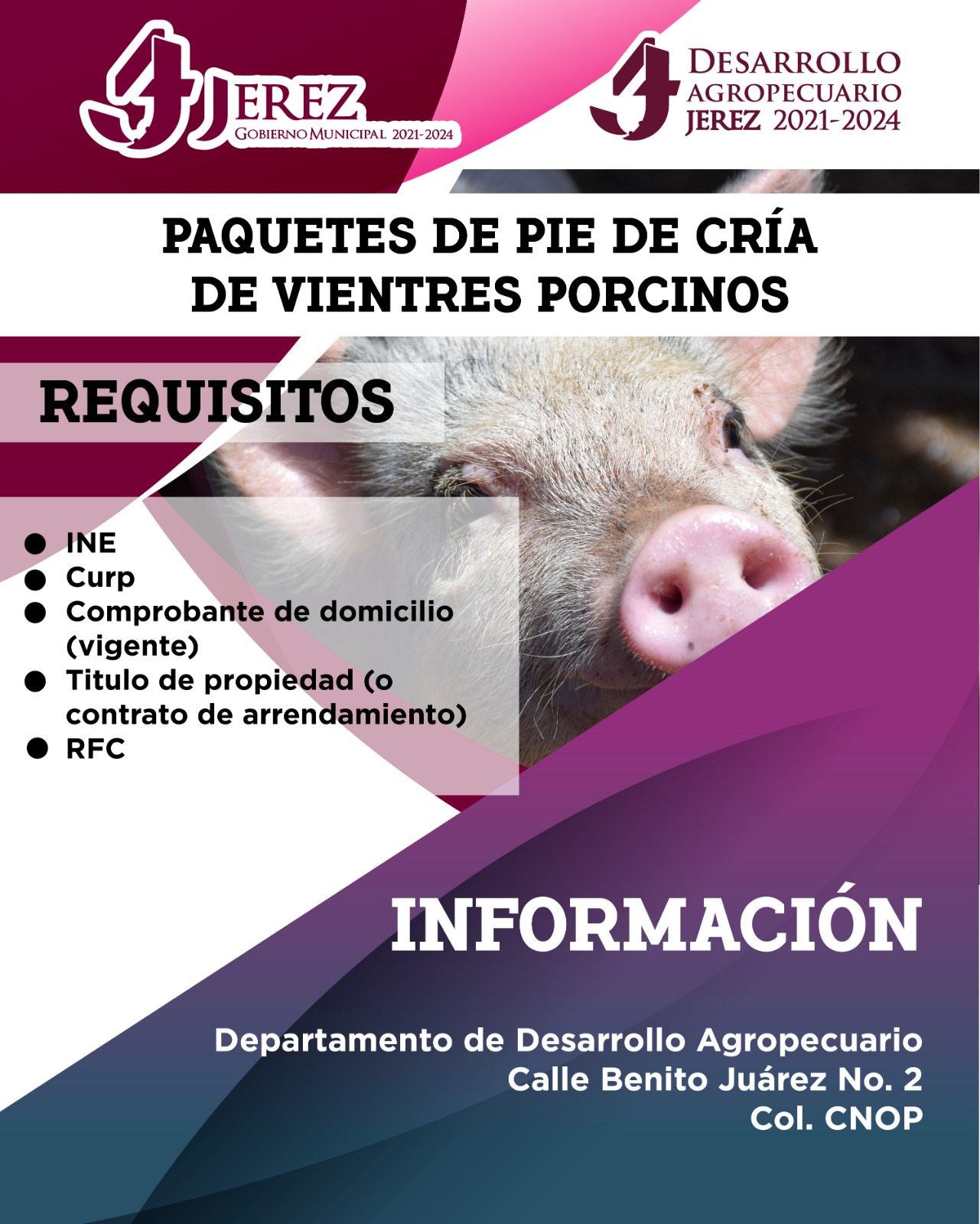 Jerez, Zac.-Para cumplir con el compromiso de desarrollo rural en Jerez y en concordancia con el Plan Municipal de Desarrollo del gobierno de Jerez 2021-2024, el Departamento de Desarrollo Agropecuario abrió la ventanilla del programa municipal «Paquetes de pies de cría de vientres porcinos». El objetivo de este programa es beneficiar a los porcicultores jerezanos y estará abierto hasta mediados de abril.