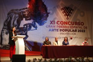 Jerez de García Salinas, Zac.- En el interior de uno de los recintos con mayor identidad jerezana, el Teatro Hinojosa, esta tarde se llevó a cabo la Décima primera edición del Gran Premio Estatal de Arte Popular en su edición 2022; el cual fue convocado por la Secretaría de Cultura, a través del Fondo Nacional para el Fomento a las Artesanía (FOANRT), la Secretaría de Economía del Estado a través de la Subsecretaría para el Desarrollo Artesanal, teniendo como cede anfitrión al H. Ayuntamiento de Jerez encabezado por el Dr. José Humberto Salazar Contreras; se realizó la premiación correspondiente con la el firme objetivo de brindar identidad histórica y cultural, así como reconocer a los artesanos Zacatecanos más destacados y las tradiciones en el arte popular; en las más de 20 categorías en las que se incluyen, alfarería, cerámica, telar de pedal y bastidor, deshilado, madera, monturas, cantera, fibras vegetales, arte wixárika, cartonería , máscaras, judas tradicional, juguete tradicional, miniatura, arracadas, nuevos diseños entre otros.