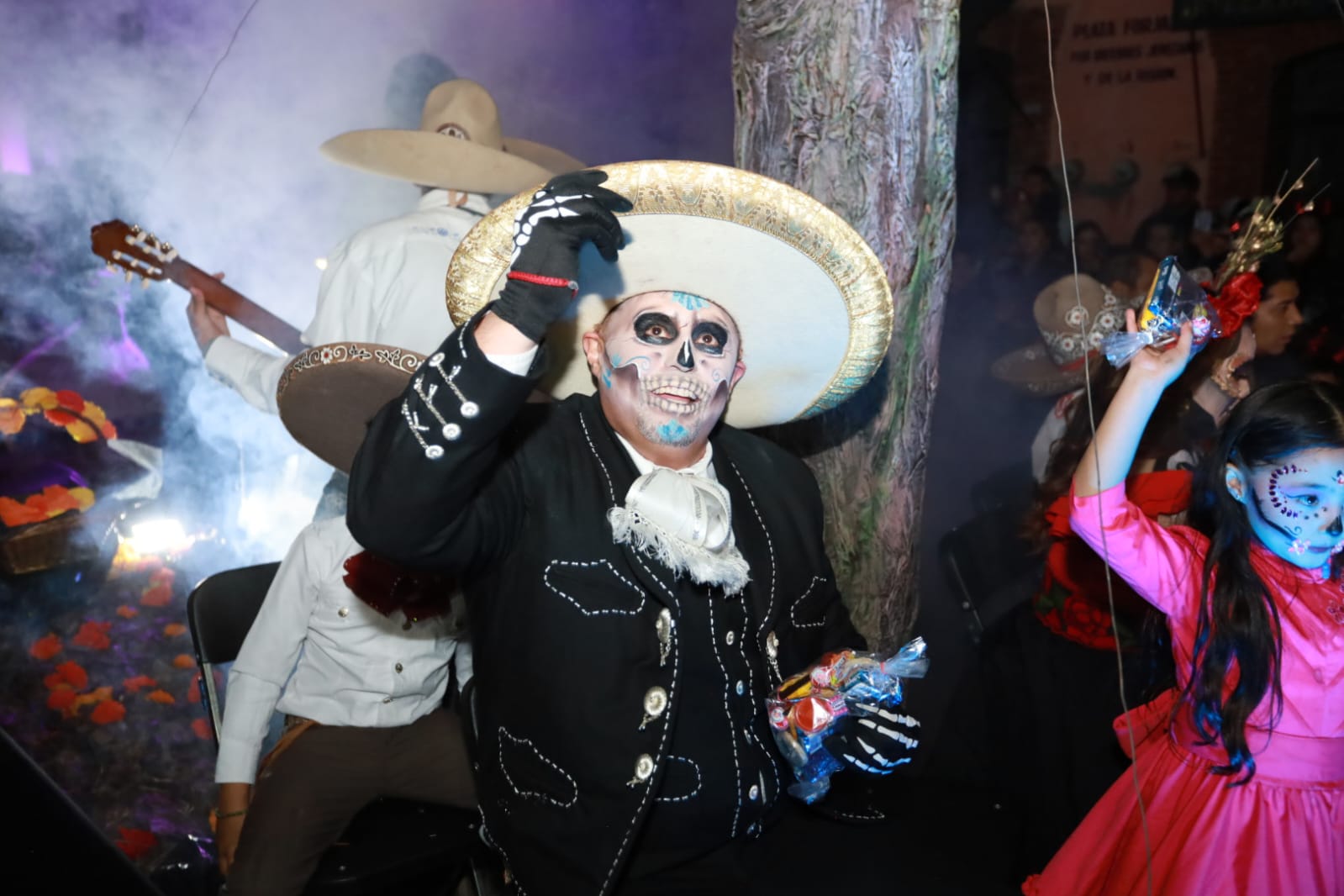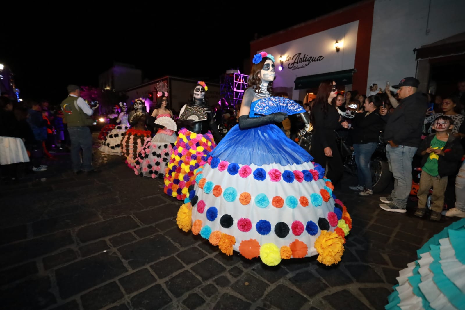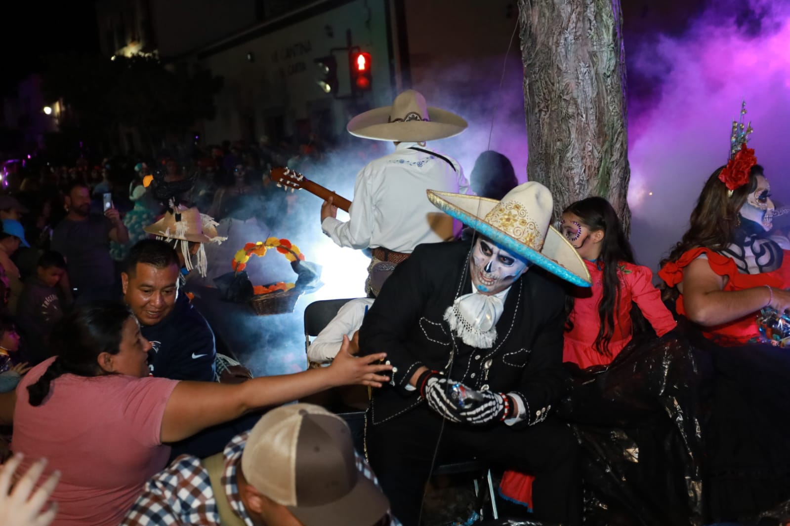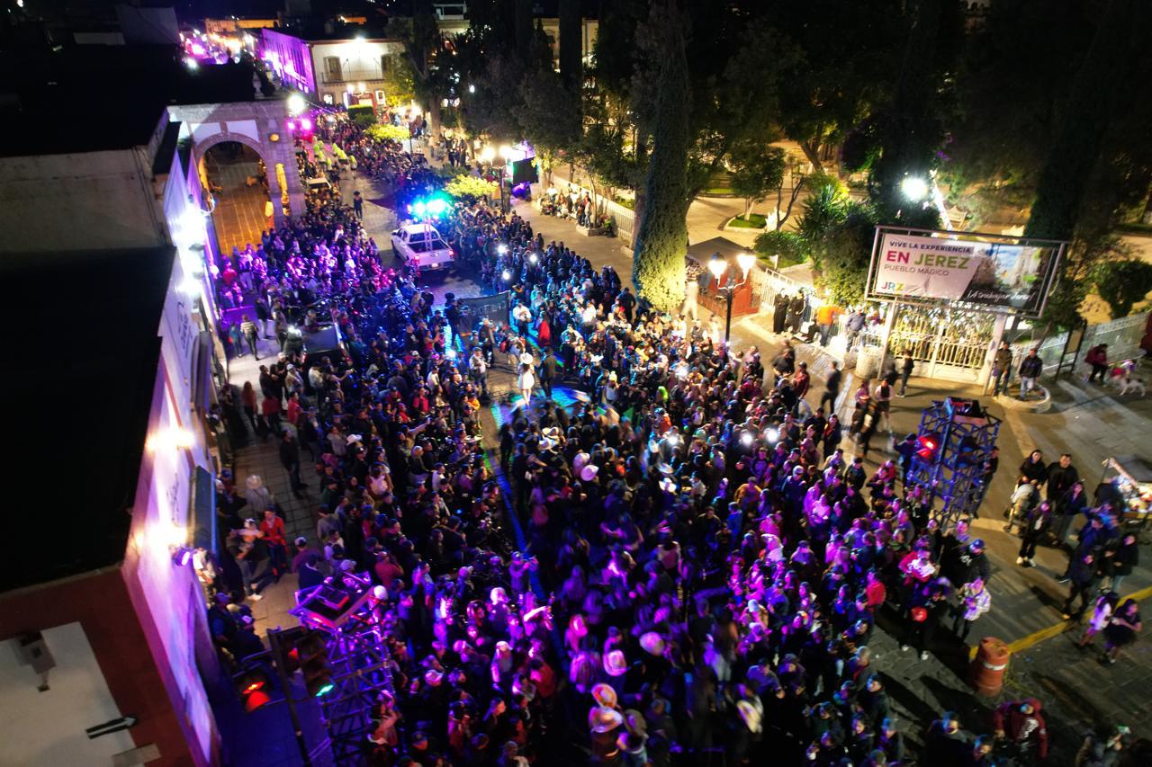 El Alcalde y su familia, disfrazados de calaveras con trajes típicos mexicanos, repartieron «el muerto» a niñas y niños, en compañía de la Orquesta Sinfónica Juvenil de Jerez. Bajo un cielo iluminado por la pirotecnia, el esperado desfile comenzó, con cientos de personas a lo largo de las calles, donde catrinas a pie y a caballo, el COBAEG, el CETIS 114, el SIMAPAJ, Protección Civil y Bomberos, Servicios Públicos, Gorilaz y el Turibus con la participación del DJ Luis Dena, formaron parte del espectáculo, junto a grupos de baile.