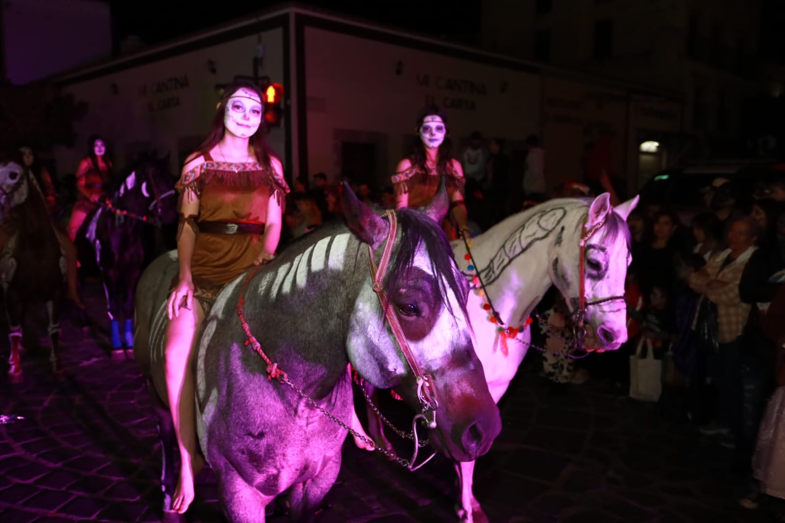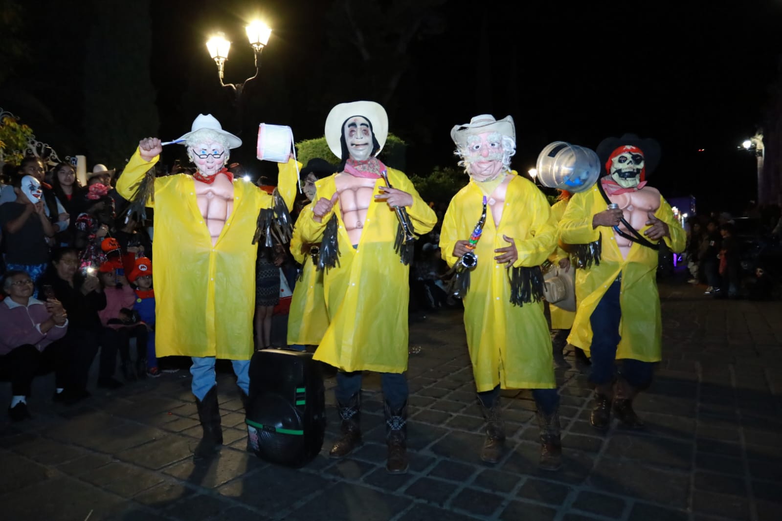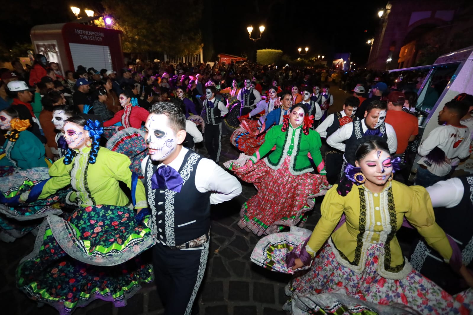 El Alcalde y su familia, disfrazados de calaveras con trajes típicos mexicanos, repartieron «el muerto» a niñas y niños, en compañía de la Orquesta Sinfónica Juvenil de Jerez. Bajo un cielo iluminado por la pirotecnia, el esperado desfile comenzó, con cientos de personas a lo largo de las calles, donde catrinas a pie y a caballo, el COBAEG, el CETIS 114, el SIMAPAJ, Protección Civil y Bomberos, Servicios Públicos, Gorilaz y el Turibus con la participación del DJ Luis Dena, formaron parte del espectáculo, junto a grupos de baile.
