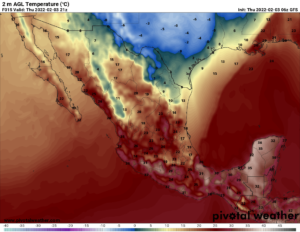 La masa de aire frío que impulsa el sistema frontal provocará durante esta tarde temperaturas muy frías-frías sobre valores 10 a 0°C en Sonora (norte), Chihuahua (norte y sierras), Coahuila (norte-centro), Nuevo León (norte), Durango (sierras) y Tamaulipas (norte), así como valores de 25 a 35°C en el occidente, sur y sureste.
