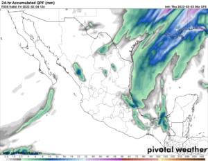 Hoy 03 de febrero, se pronostica el potencial de registrarse lluvias dispersas-aisladas sobre el norte, noreste, oriente y sureste de México debido al avance del sistema frontal 28 a través del oriente.
