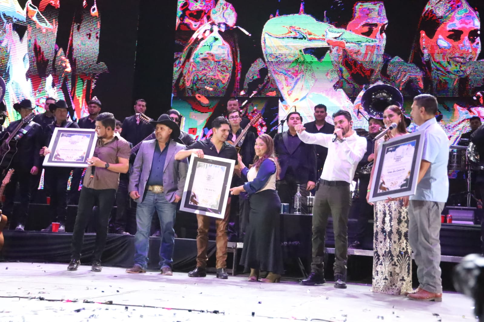 El presidente municipal Rodrigo Ureño y su esposa Estefana Casas subieron al escenario para entregar el reconocimiento a los invitados especiales, que abrieron su presentación con el tema «La Parranda», siendo recibidos con la ovacion del público.