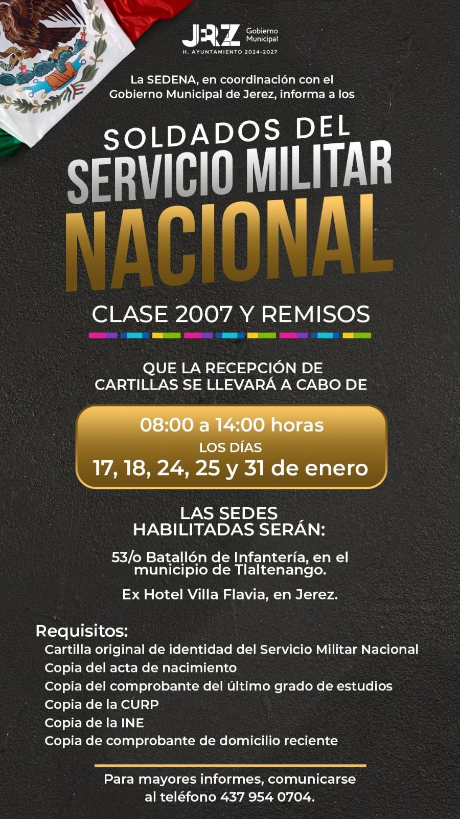 La SEDENA, en coordinación con el Gobierno Municipal de Jerez, informa a los soldados del Servicio Militar Nacional, Clase 2007 y remisos, que la recepción de cartillas se llevará a cabo de 08:00 a 14:00 horas, los días 17, 18, 24, 25 y 31 de enero.
