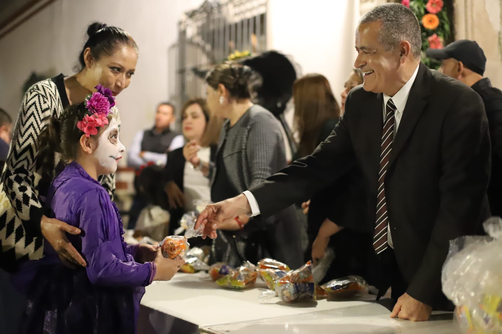 El alcalde José Humberto Salazar Contreras y su esposa, la presidenta honorífica del Sistema Municipal DIF Bertha Alicia García Duarte, cumplieron con la tradición de repartir dulces a los niños y niñas de Jerez en ocasión de las festividades del Día de Muertos.
