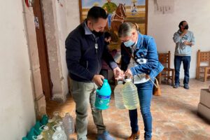 Los paquetes se entregaron de manera simbólica a cuatro instituciones: el jardín de niños Ana María Yrma Maldonado Pinedo, la primaria Adolfo López Mateos, la Secundaria Técnica 38 de Ermita de Guadalupe y la Telesecundaria Benito Juárez de Santa Rita; en total fueron 25 instituciones beneficiadas en esta primera fase; cada paquete se compone de cloro, gel antibacterial y pinol, lo que permitirá realizar la sanitización de espacios y en el caso del gel, la utilización frecuente por parte de alumnos, maestros y personal.