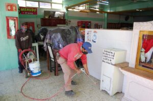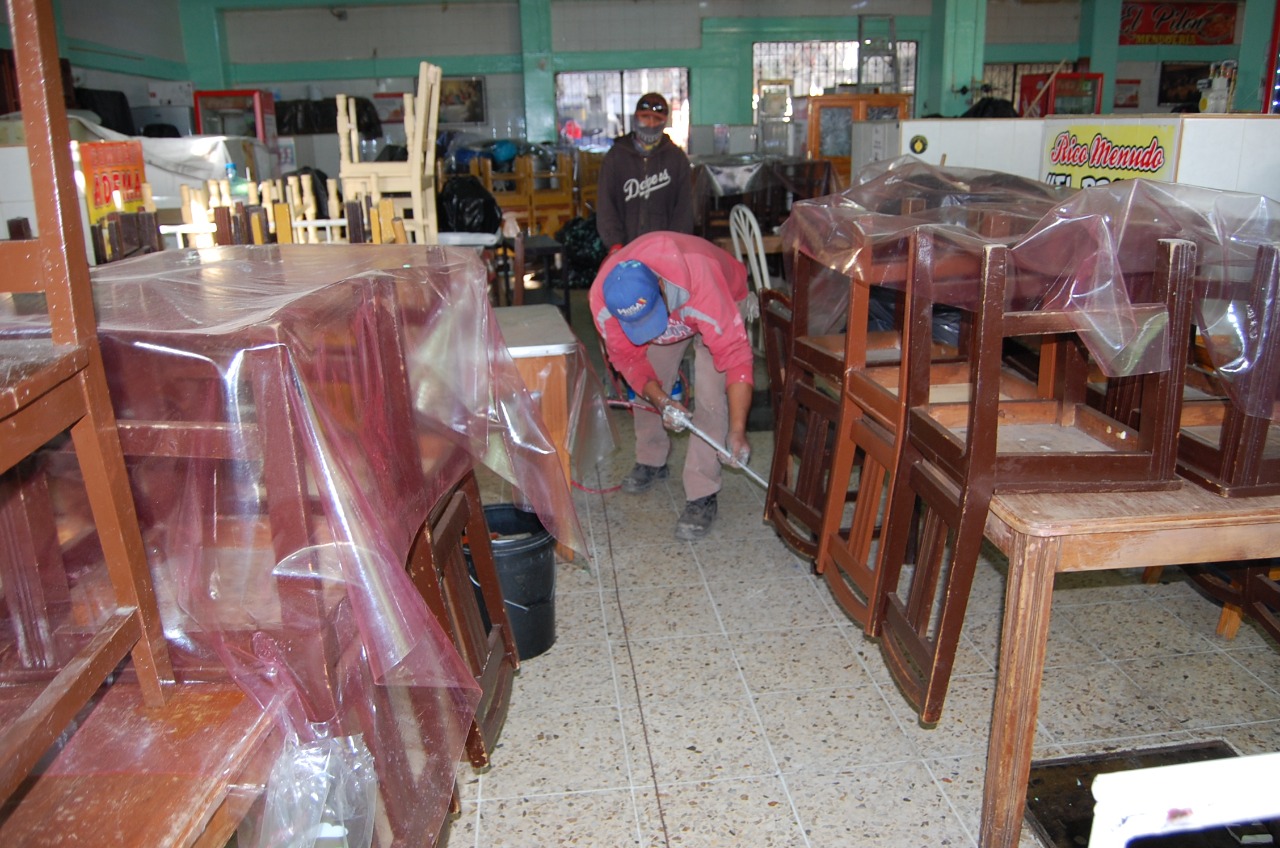 Cumpliendo con las normas establecidas en materia de regulación sanitaria, personal de servicios públicos municipales llevaron a cabo la fumigación del área de comidas en el mercado municipal Benito Juárez, tarea que ahora se desarrolla de manera más frecuente, como se acordó con la nueva directiva de los locatarios.