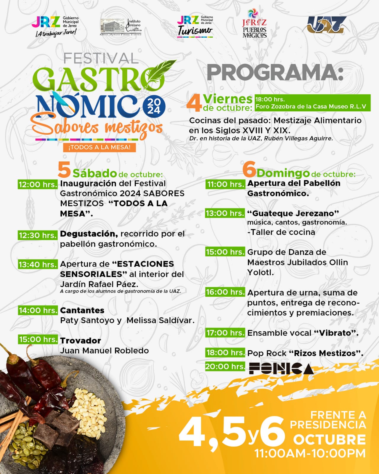 El Ayuntamiento de Jerez, encabezado por el alcalde Rodrigo Ureño, a través del Departamento de Turismo en coordinación con el Instituto Jerezano de Cultura, han organizado el Festival Gastronómico Sabores Mestizos. Del 4 al 6 de octubre, en la Plaza Principal, donde los comensales podrán disfrutar de la fusión de culturas que le dio sabor a nuestra cocina.