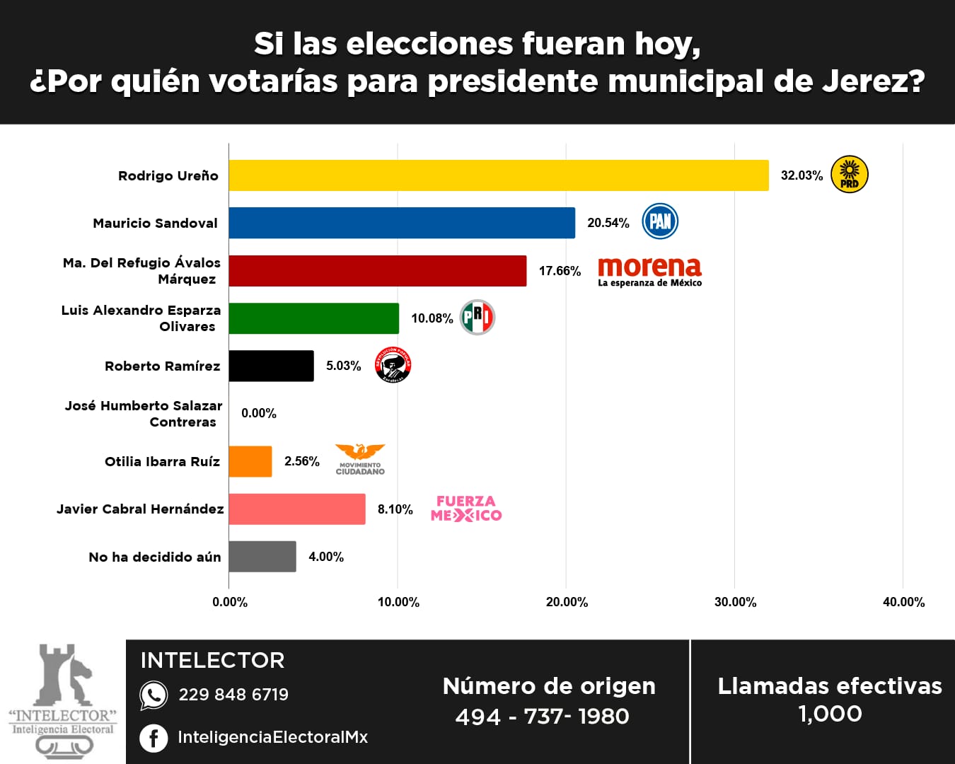 🟡El panorama electoral que se vive en el municipio de Jerez de acuerdo a datos compilados por la casa encuestadora INTELECTOR que da a conocer en su muestreo hecho al día 20 de mayo del 2024, relativo a la contienda a la presidencia municipal que ponen al candidato del PRD Rodrigo Ureño al frente de sus adversarios con un 32.03 puntos porcentuales.