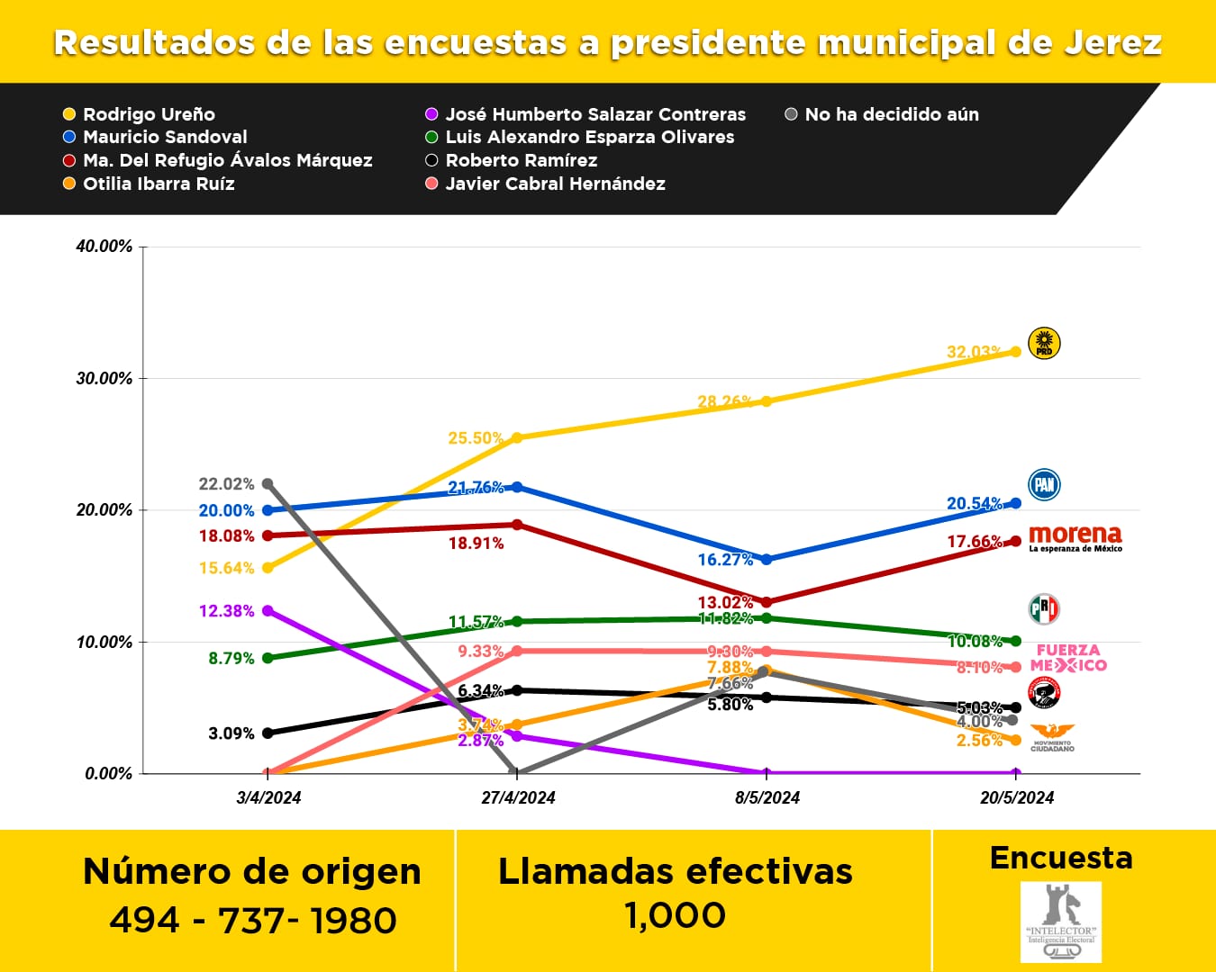 🟡El panorama electoral que se vive en el municipio de Jerez de acuerdo a datos compilados por la casa encuestadora INTELECTOR que da a conocer en su muestreo hecho al día 20 de mayo del 2024, relativo a la contienda a la presidencia municipal que ponen al candidato del PRD Rodrigo Ureño al frente de sus adversarios con un 32.03 puntos porcentuales.