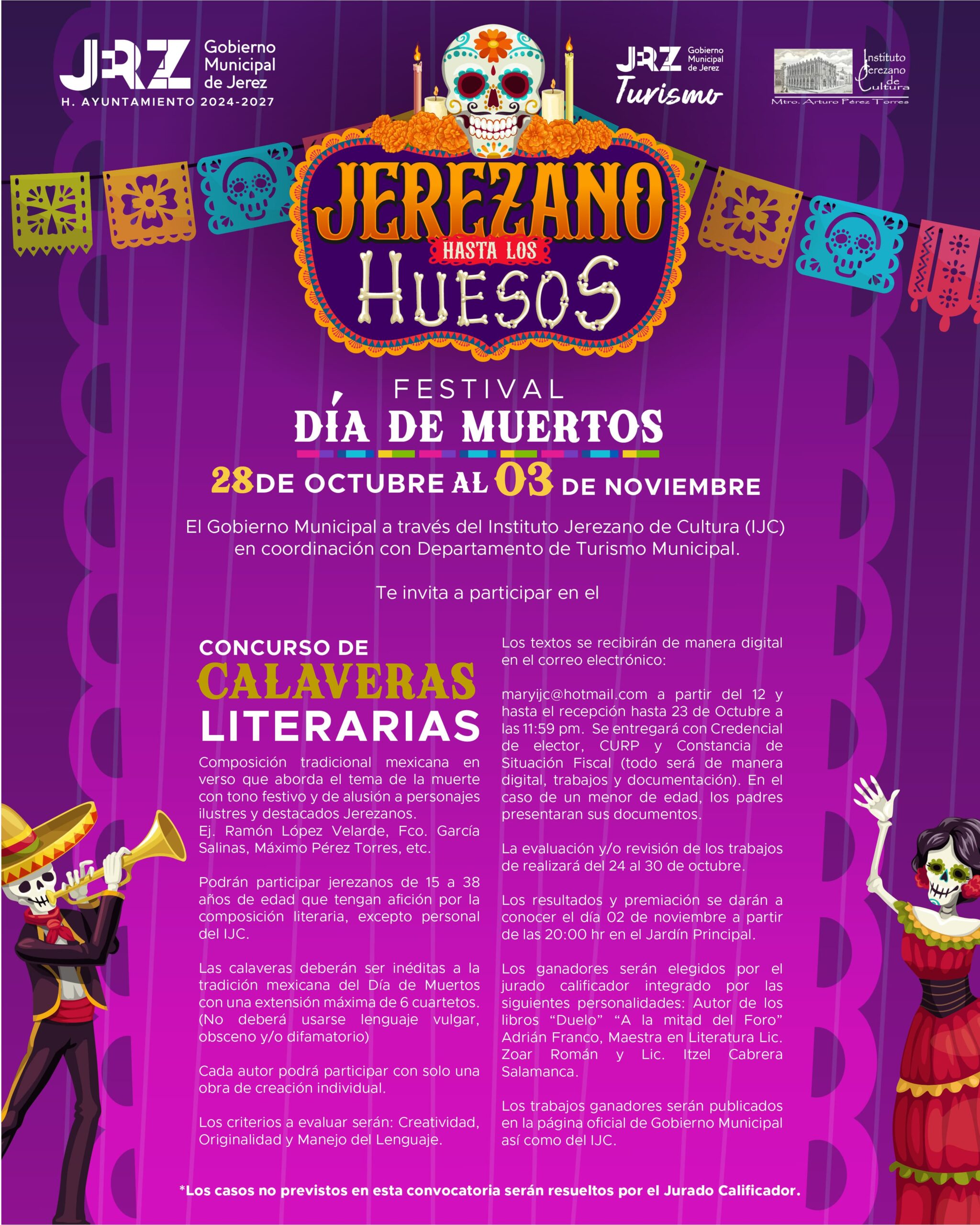 El Ayuntamiento de Jerez, a través del Instituto Jerezano de Cultura, invita a todos los creativos y amantes de la tradición a participar en nuestro Concurso de Calavera Literaria . Demuestra tu ingenio y creatividad con las clásicas rimas llenas de humor, sátira y tradición que celebran la vida y la muerte.