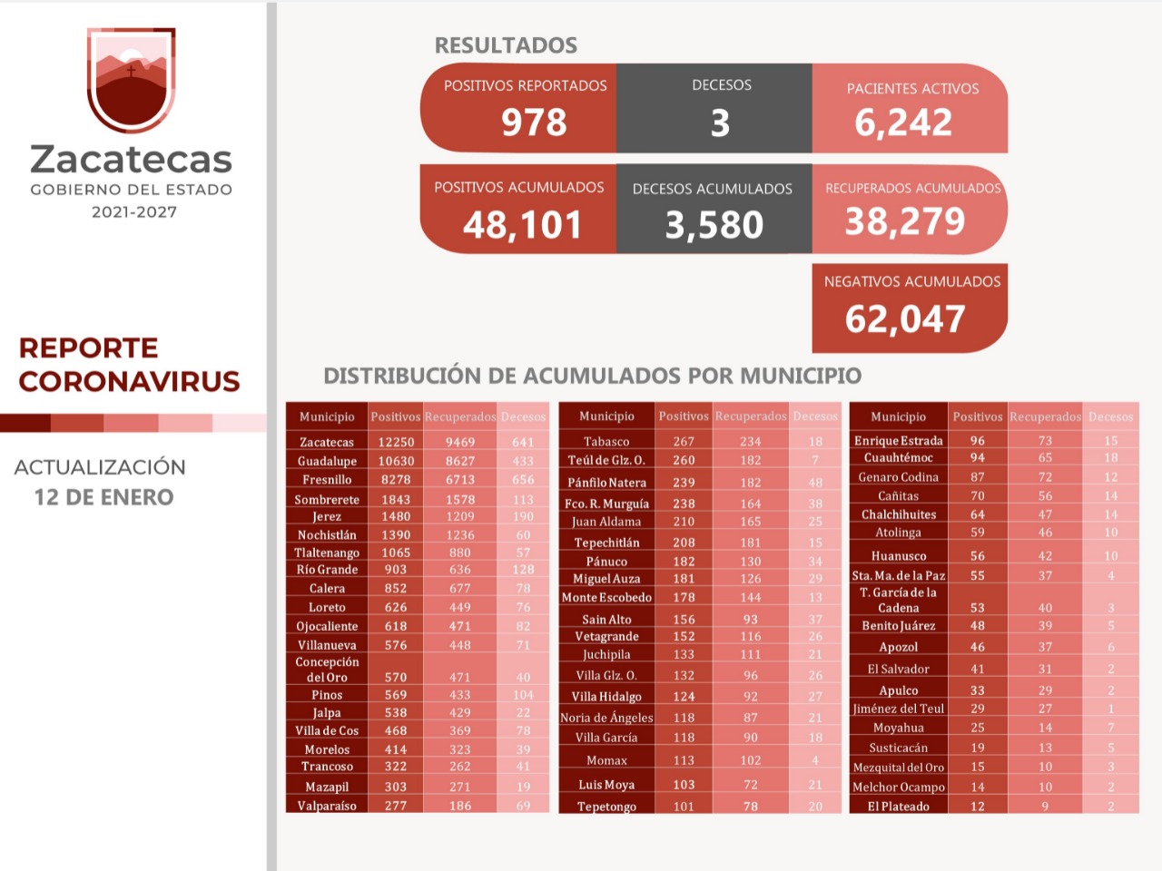 Zacatecas, Zac., 12 de enero de 2022.- Aunque Zacatecas tiene capacidad para atender a pacientes de COVID-19, gracias a la coordinación interinstitucional, la Secretaría de Salud del estado pide a la población no confiarse ni relajar los cuidados para evitar que los contagios sigan creciendo. Hoy informa de 978 nuevos casos positivos, 28 recuperados y tres muertes por complicaciones derivadas del virus.