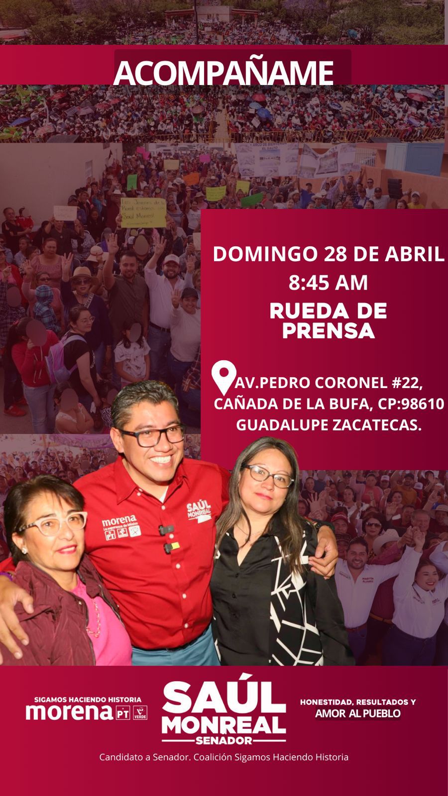 Saúl Monreal dio cuenta de los avances alcanzados en los 58 días que van de campaña territorial, sectorial y diferente. El estado se sigue recorriendo con buen compromiso y ánimo. Reconoció el apoyo y soporte que le ha brindado el pueblo zacatecano, así como dijo estar animado por la presencia de su hermano, el ex gobernador de Zacatecas y ahora senador de la República, Ricardo Monreal Ávila, «él ha sido mi maestro y guía en política; de él he aprendido mucho. Agradezco profundamente el respaldo que nos da a las y los candidatos de MORENA».