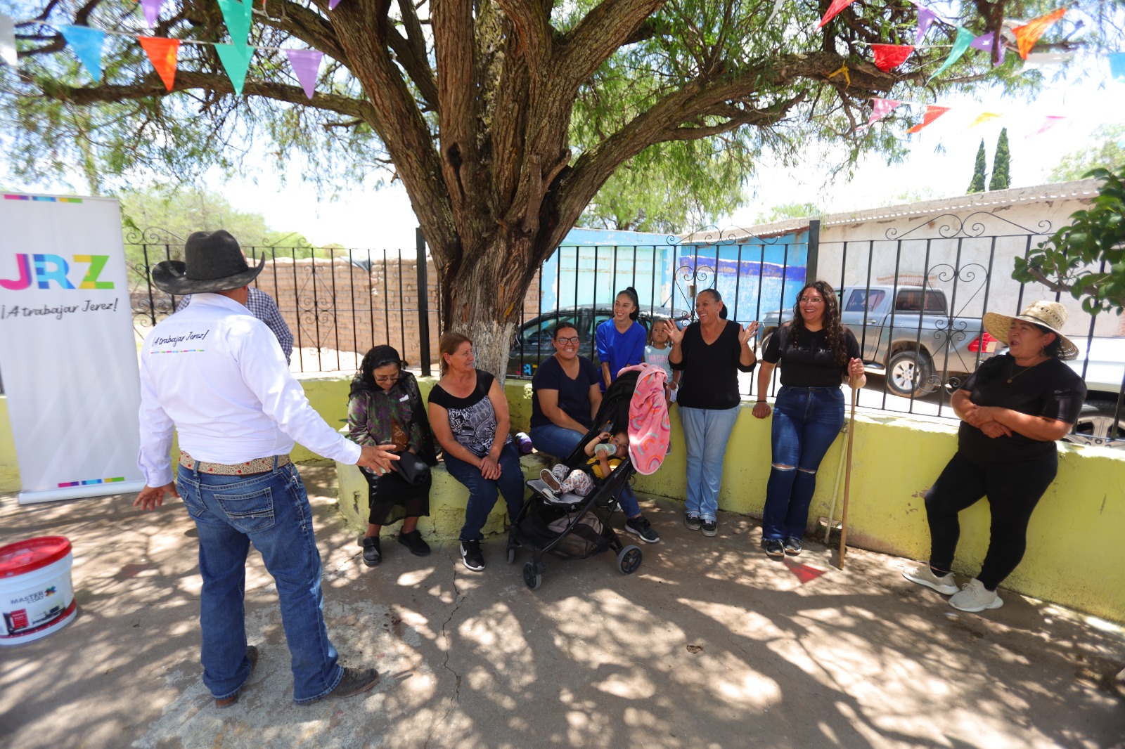 Durante su visita a la comunidad de El Saucito, el alcalde entregó pintura para mejorar espacios públicos y fortalecer el sentido de pertenencia comunitaria. Posteriormente, en la comunidad de Briseño, entregó mil ladrillos, una tonelada de cemento y cuatro piezas de armex, materiales que serán utilizados para obras prioritarias impulsadas por los propios vecinos.