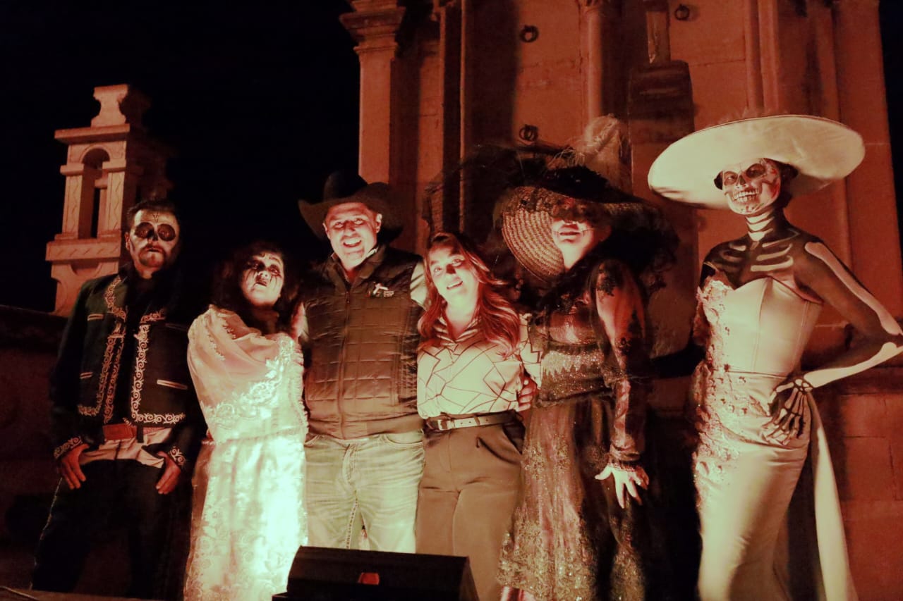 En el recorrido nocturno que sirvió como adelanto del Festival, acompañaron al Alcalde Ureño, la Directora de Vinculación Estratégica María de Lourdes Imbert Carreón, el Subsecretario de Turismo Iván De Santiago, la Presidenta Honorífica del DIF Estefana Casas, la Subdirectora de Desarrollo Social de Jerez Elizabeth Murillo y la titular de Turismo Municipal Cristiana Salcedo.