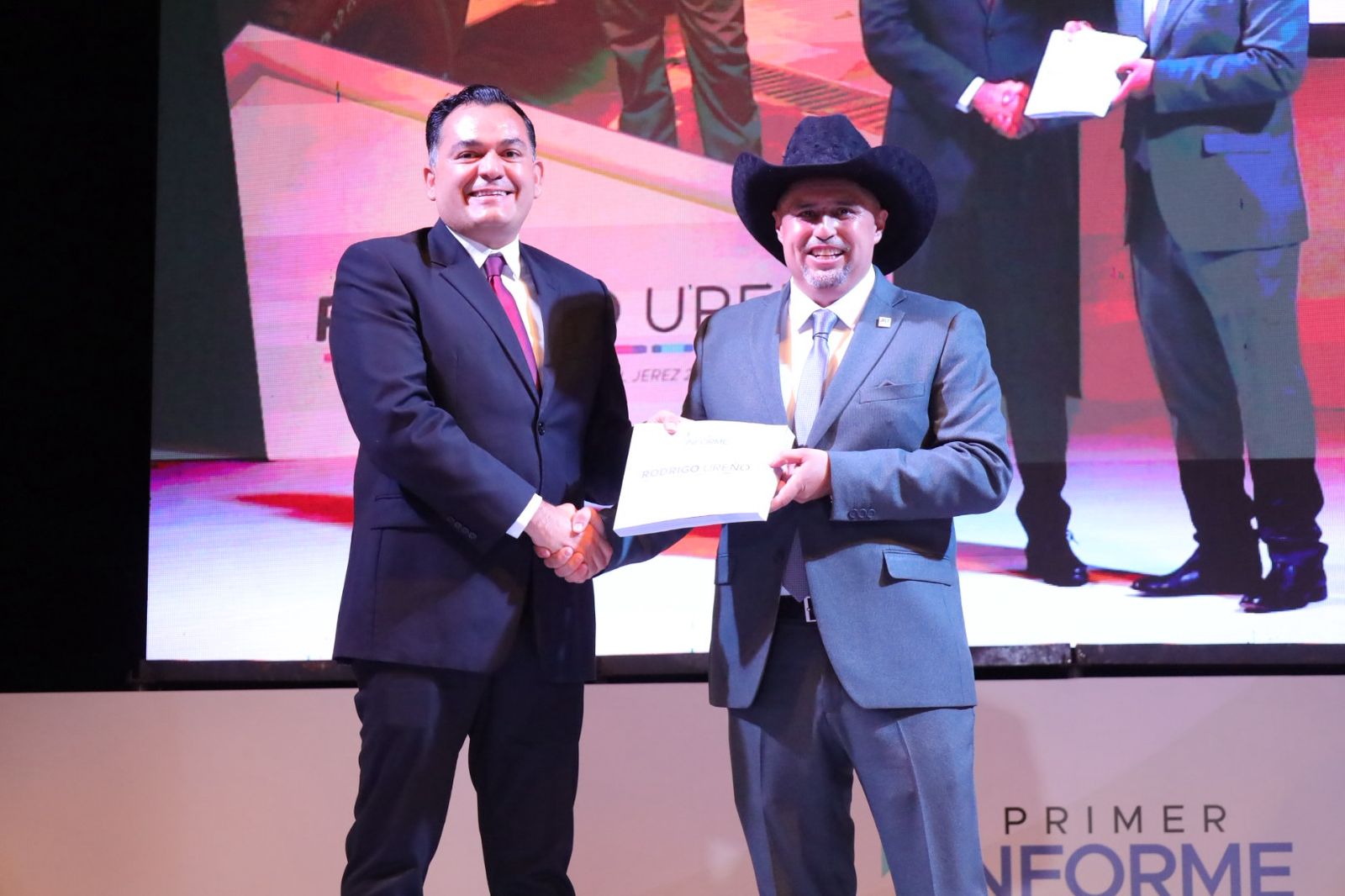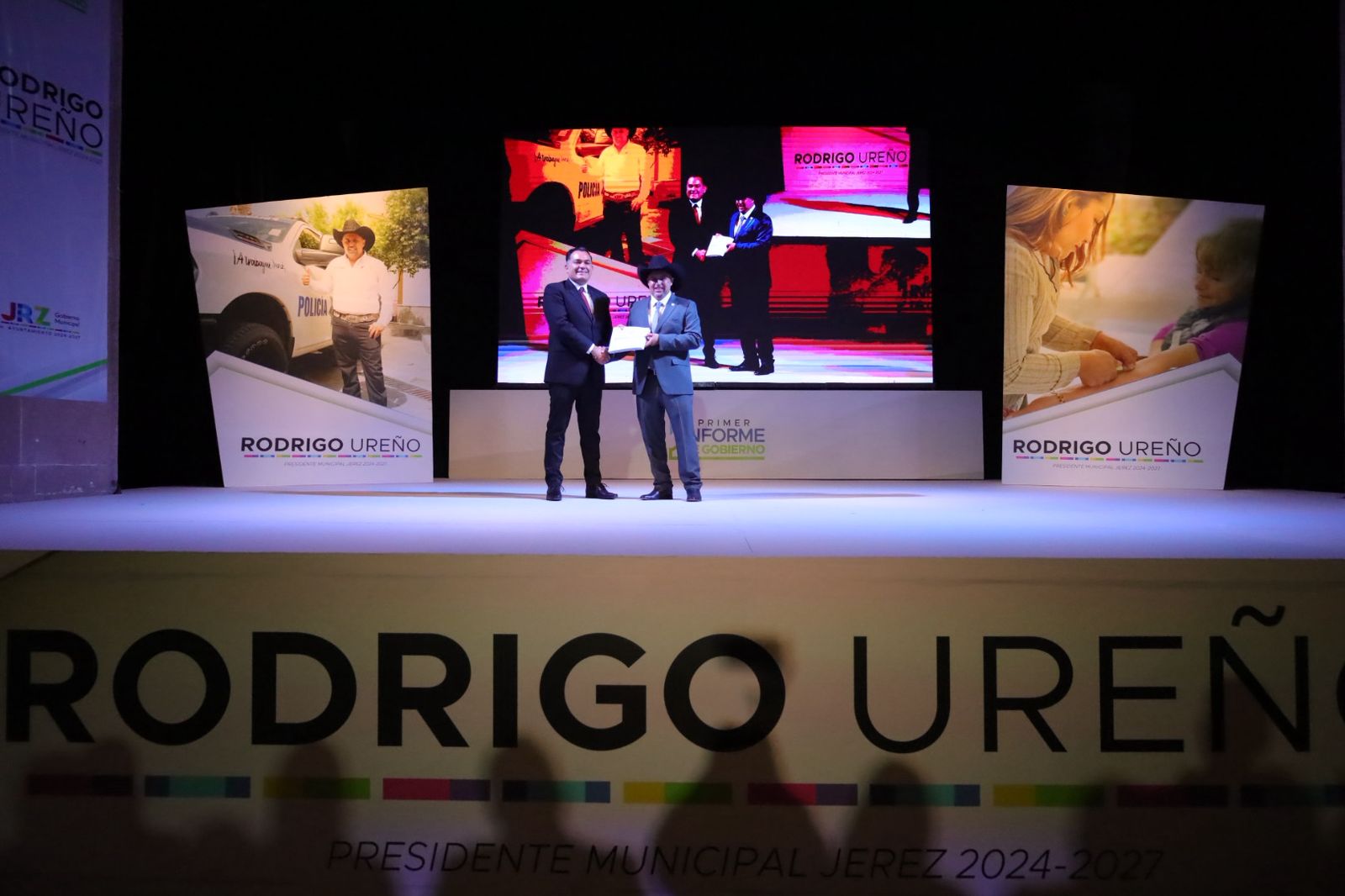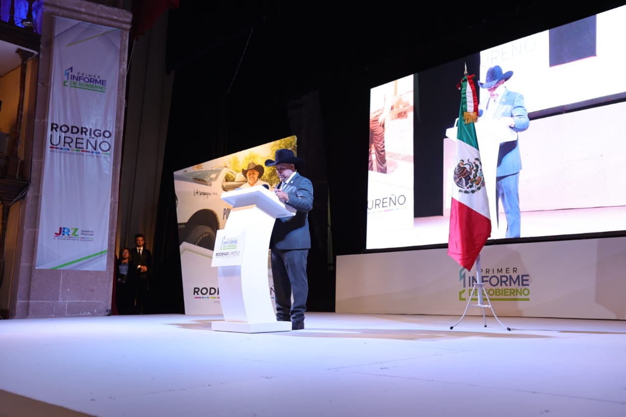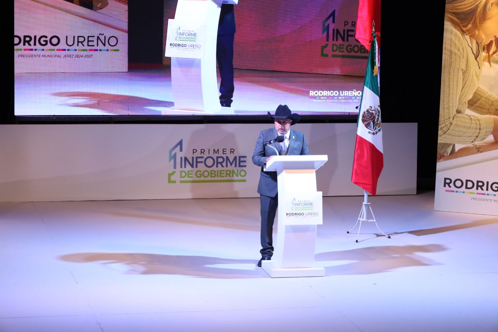 En un marco de unidad y compromiso, el presidente municipal Rodrigo Ureño rindió su Primer Informe de Gobierno ante la presencia de legistaldores, autoridades federales, estatales, municipales y jerezanos que se dieron cita en el Teatro Hinojosa, un espacio que, dijo, “simboliza la grandeza cultural de Jerez”.
