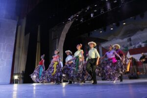 Jerez de García Salinas, Zac.- La noche de este lunes, el escenario del majestuoso Teatro Hinojosa fue engalanado por la Compañía de Danza Folclórica Cuezcomatl de Cuescomate, Veracruz, amenizada por la música alegre y distintiva veracruzana del grupo de sones jarochos de la Compañía Tetlalpan Son; deleitando y alegrando los corazones de las y los jerezanos y sus turistas, con coreografías y pasos impregnados de alegría, coloridos trajes típicos veracruzanos y una variedad del folklor jarocho; dentro del marco del XXIII Festival Nacional de Danza “Armando Correa González”, en su tercer día.