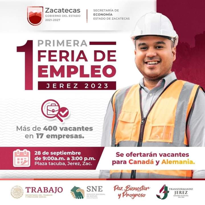 Con el objetivo de impulsar la generación de empleo y el desarrollo económico en el municipio de Jerez, el Gobierno del Estado de Zacatecas, a través de la Secretaria de Economía, en coordinación con el H. Ayuntamiento de Jerez, invitan a la ciudadanía a participar en la Primera Feria del Empleo Jerez 2023.