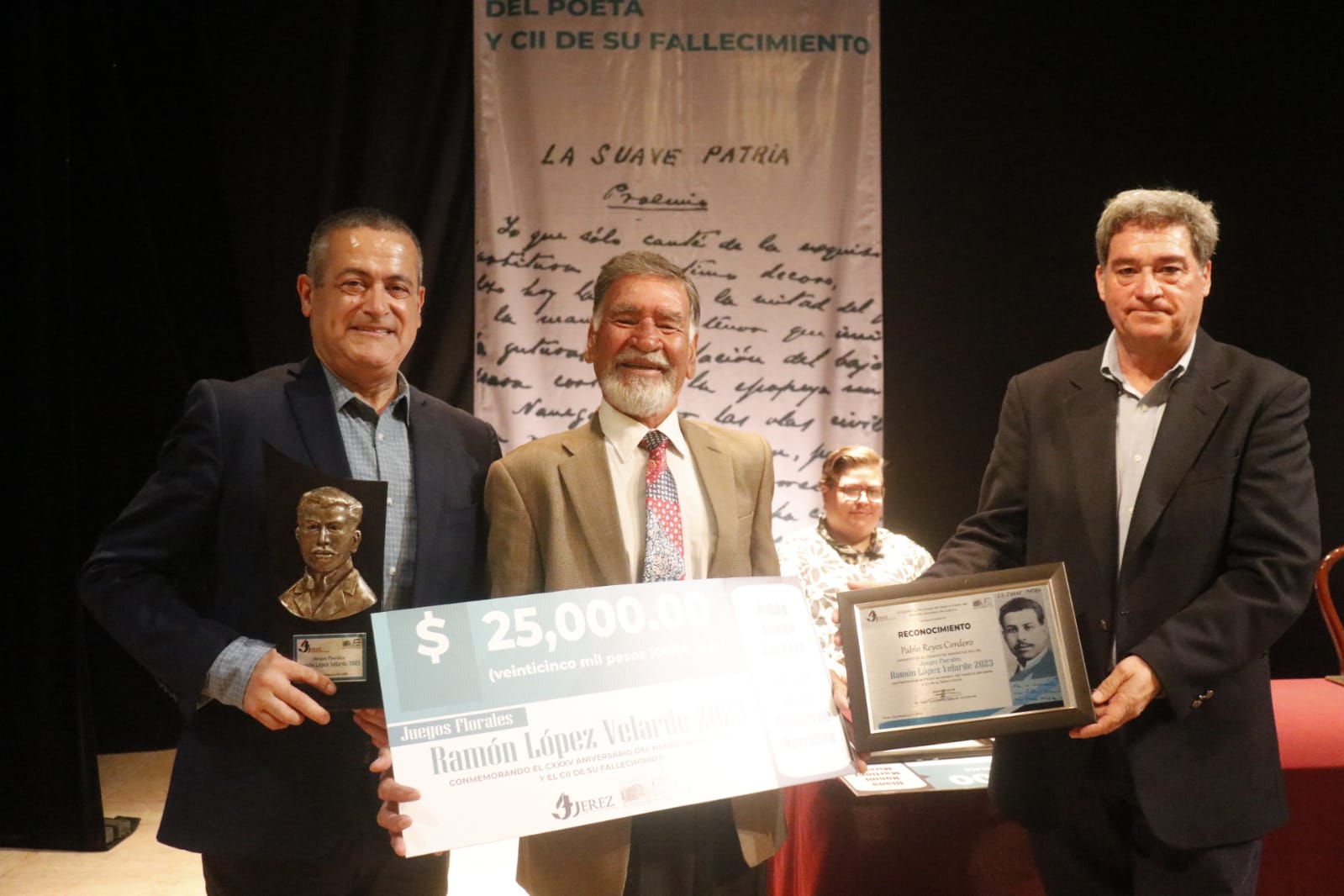 El alcalde de Jerez José Humberto Salazar Contreras encabezó la premiación a los ganadores de los Juegos Florales Ramón López Velarde 2023, al poeta y periodista potosino Rubén Alexandro Roque Mendoza en el género de poesía; en narrativa al escritor, artista plástico y periodista nacido en Trancoso, Pablo Reyes Cordero, y el premio especial al mejor trabajo jerezano a la poetiza local Diana Noemí Martínez Mireles.