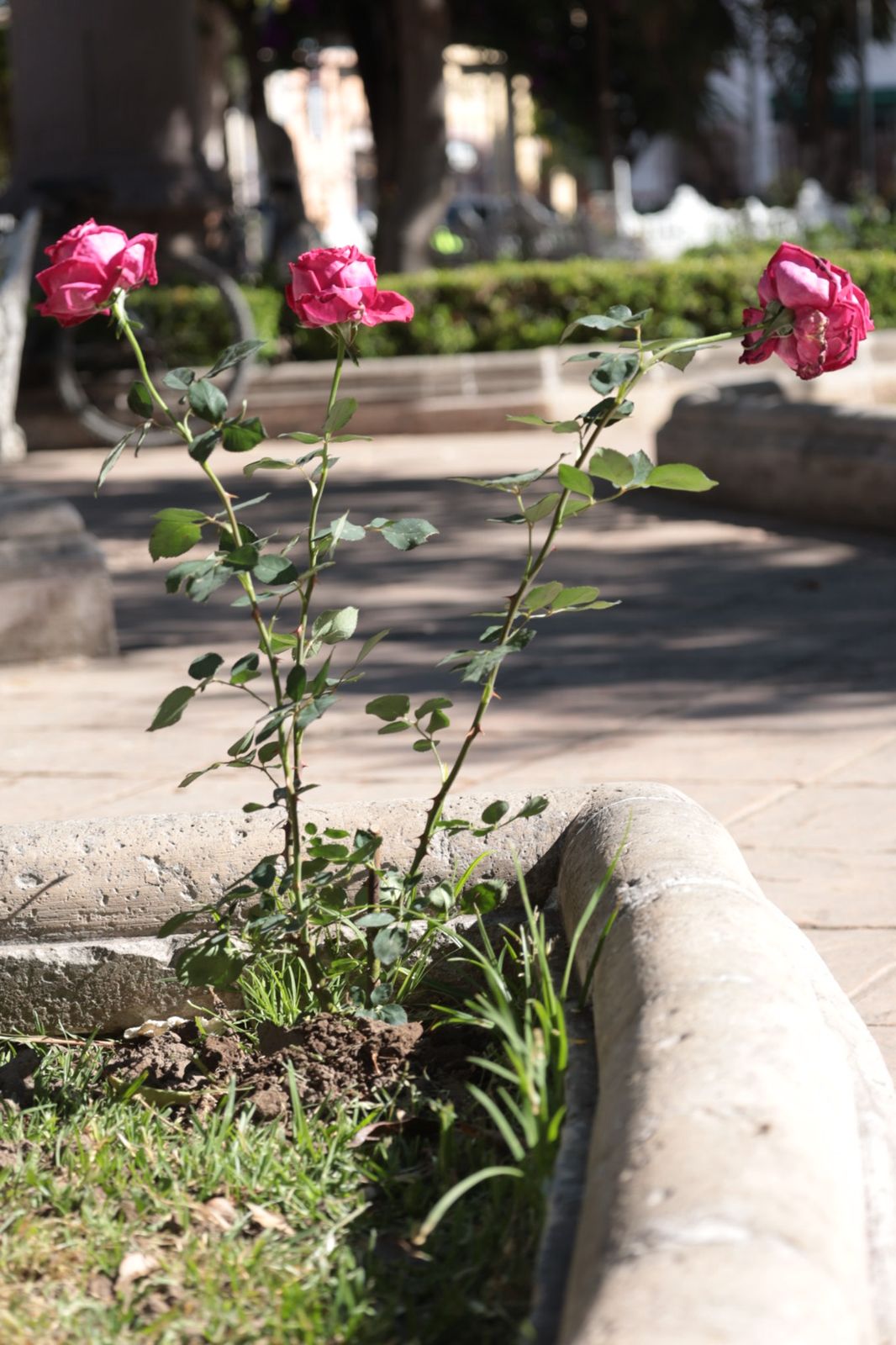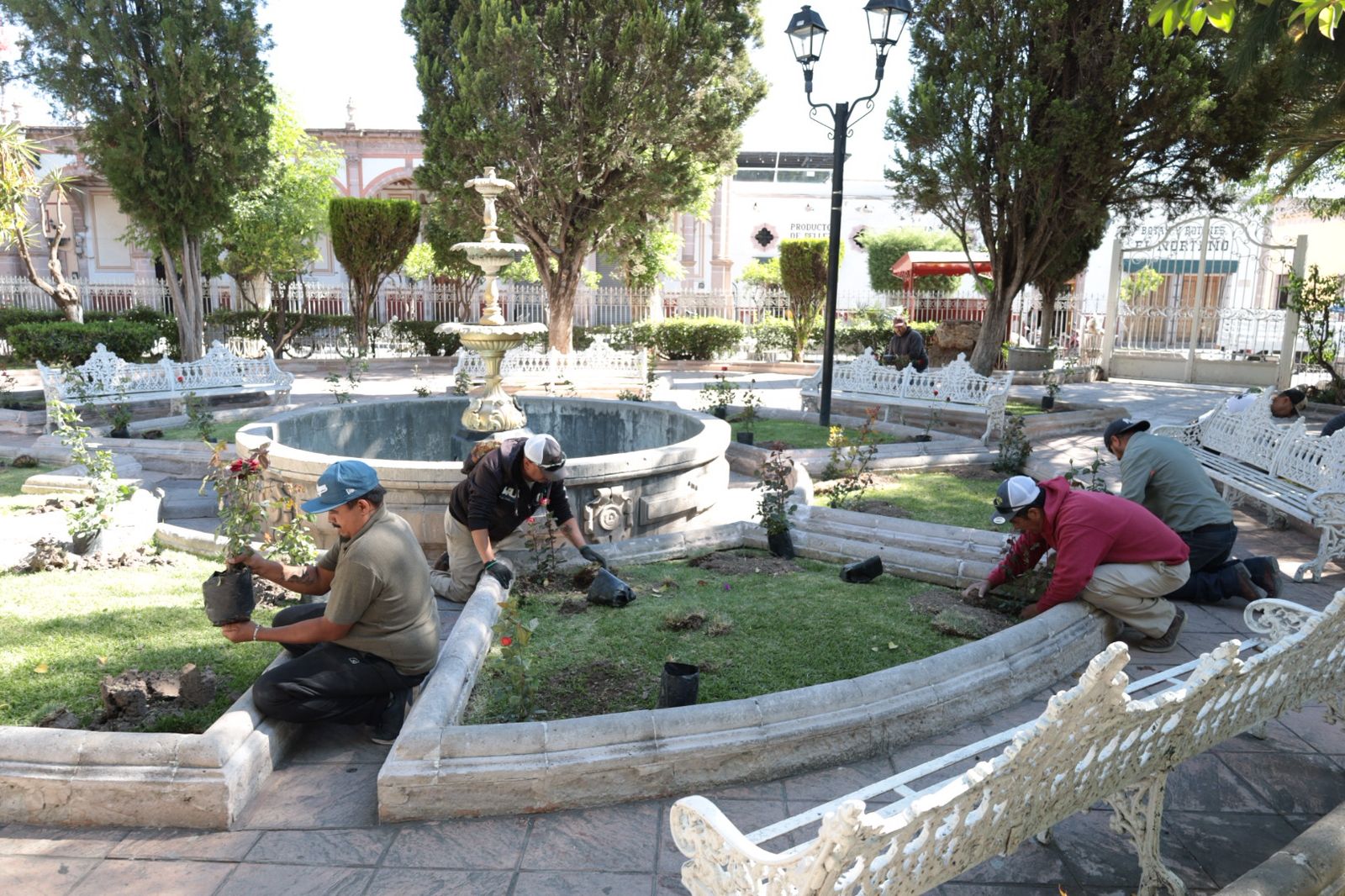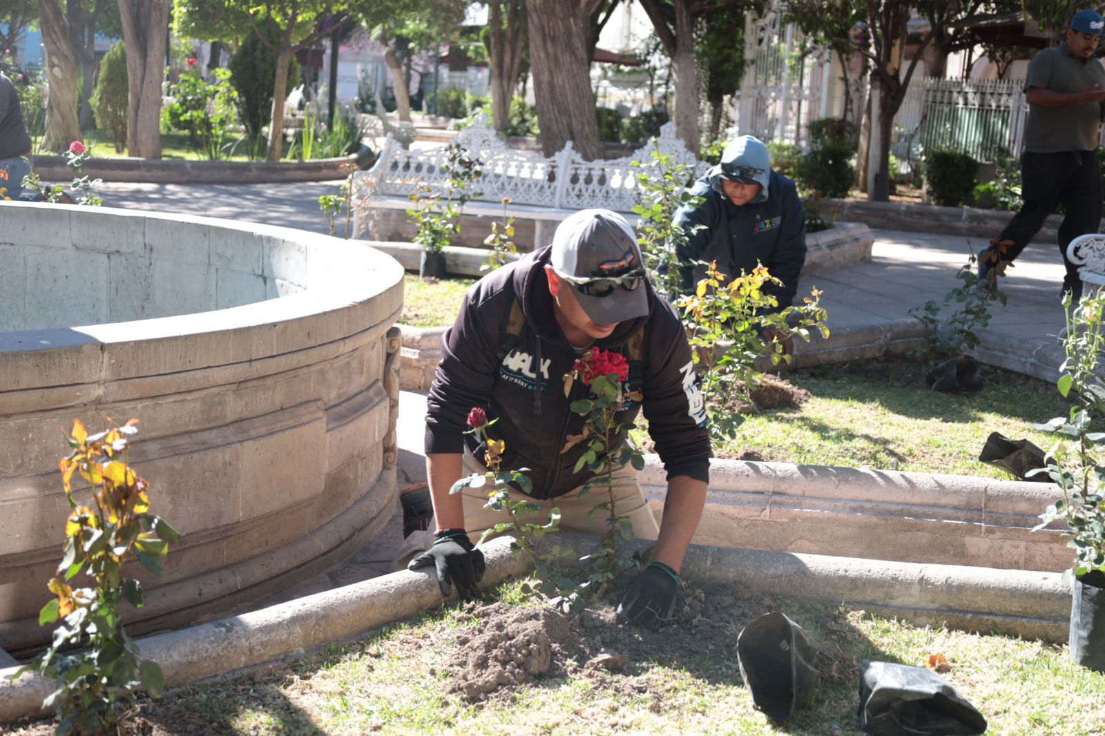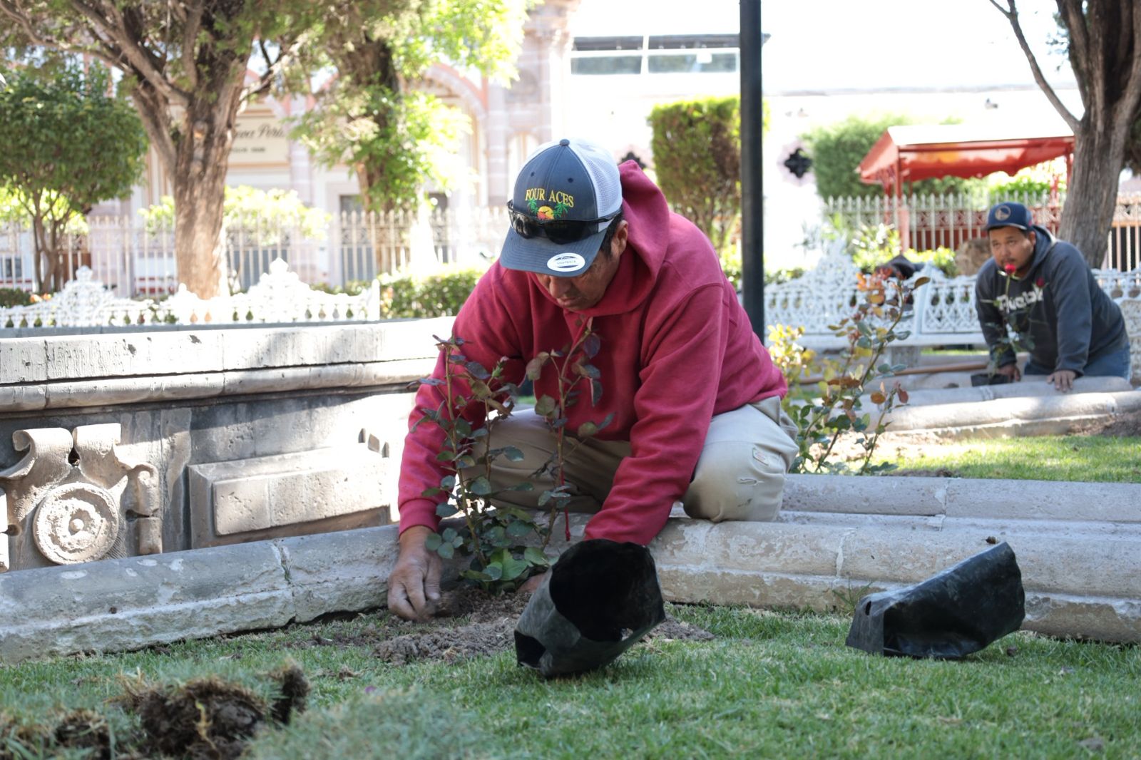 Como parte de estas acciones, se llevó a cabo la plantación de 230 rosales, 200 lirios y 250 truenos, con el objetivo de revitalizar el perímetro del jardín y fortalecer la imagen urbana de uno de los espacios públicos más representativos del municipio.