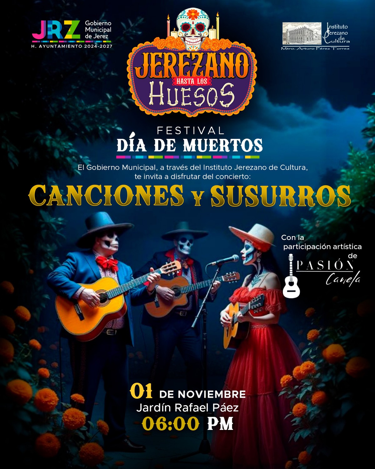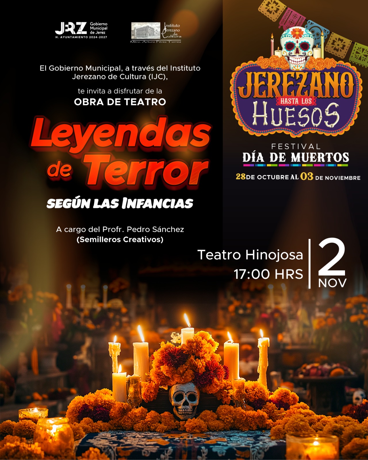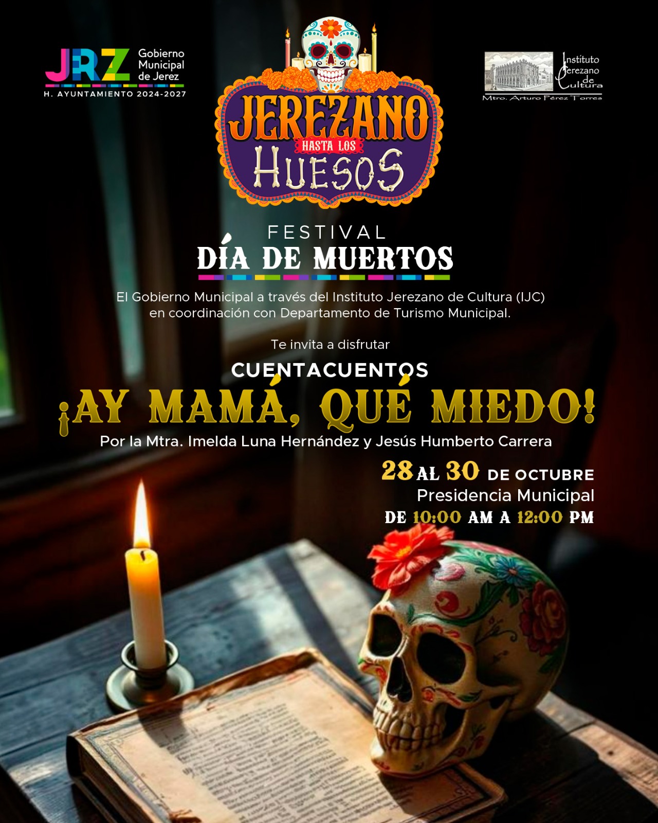 El Gobierno Municipal de Jerez, a través del Instituto Jerezano de Cultura (IJC), te invita a disfrutar del Festival Día de Muertos “Jerezano Hasta los Huesos”, del 28 de octubre al 3 de noviembre de 2024.