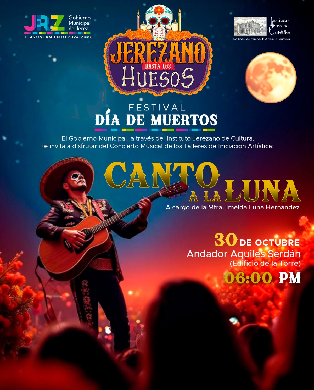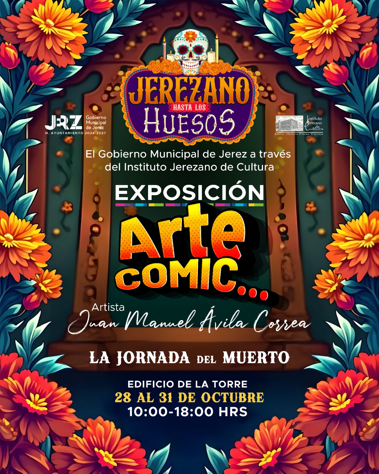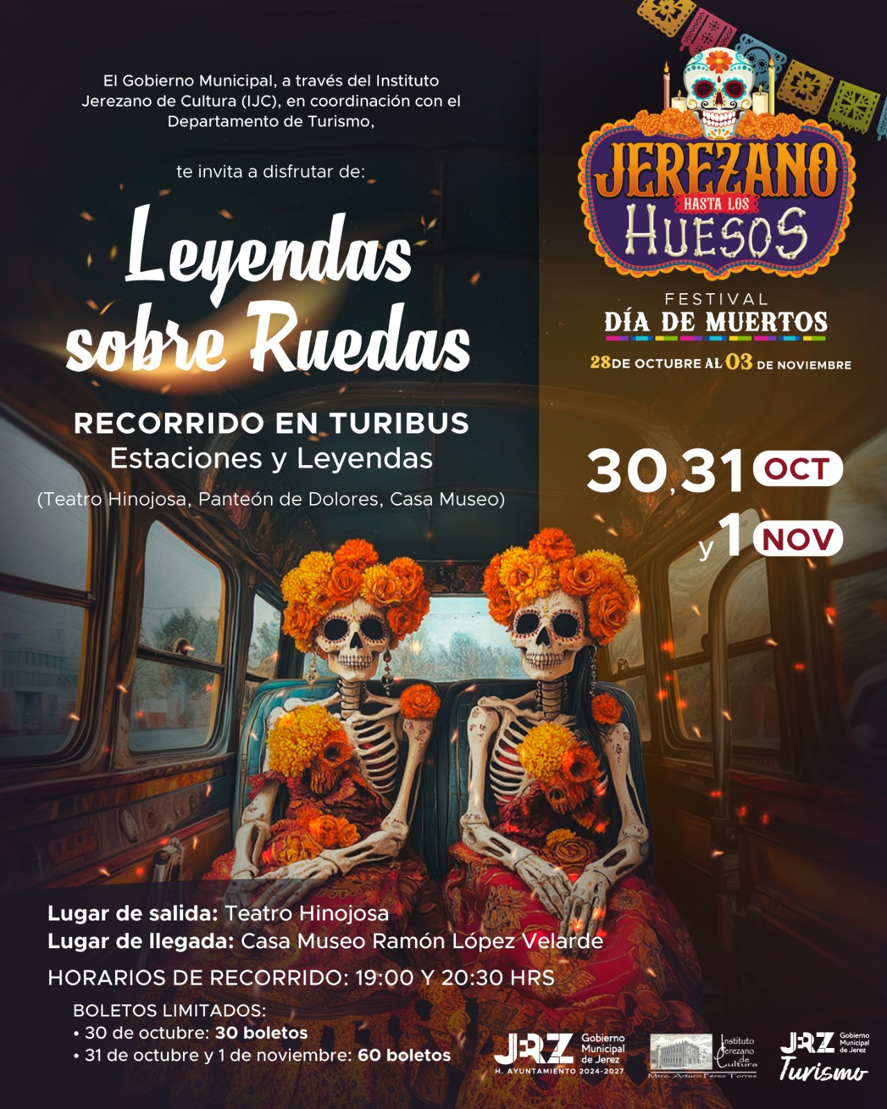 El Gobierno Municipal de Jerez, a través del Instituto Jerezano de Cultura (IJC), te invita a disfrutar del Festival Día de Muertos “Jerezano Hasta los Huesos”, del 28 de octubre al 3 de noviembre de 2024.