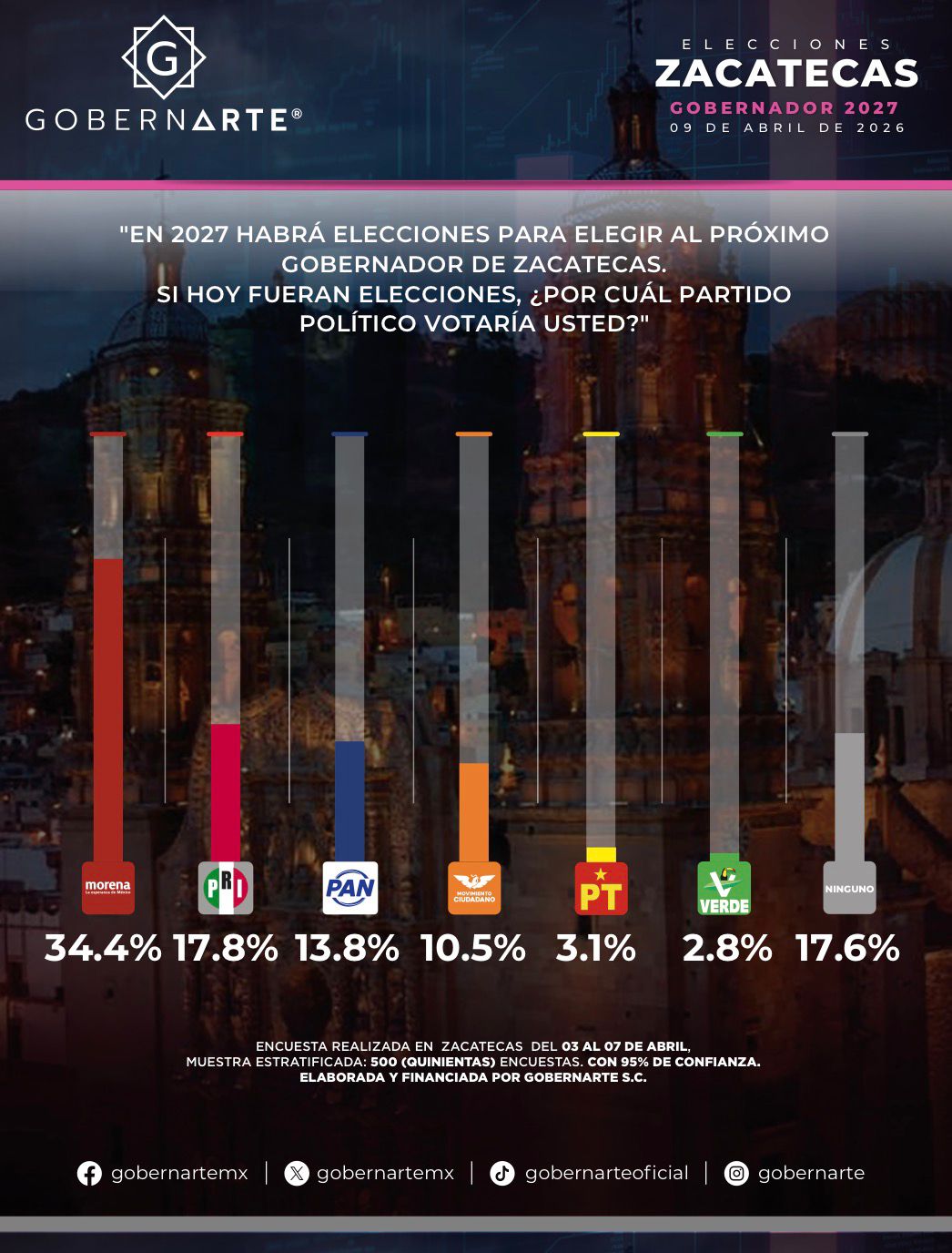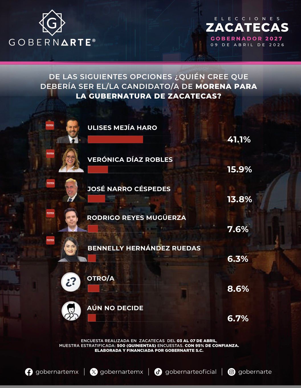 Zacatecas, Zac.- El diputado federal Ulises Mejía Haro continúa consolidándose como el perfil mejor posicionado dentro de Morena rumbo a la gubernatura de Zacatecas, de acuerdo con la más reciente encuesta nacional de GobernArte.