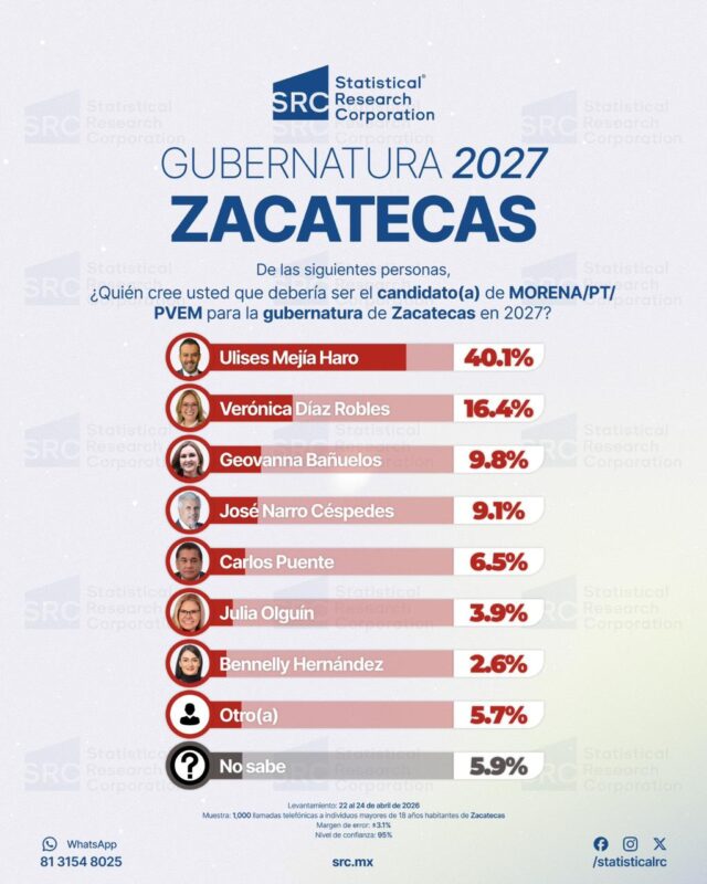 En Zacatecas, Morena mantiene un escenario favorable al registrar una intención de voto del 40.6%, consolidándose como la principal fuerza política.