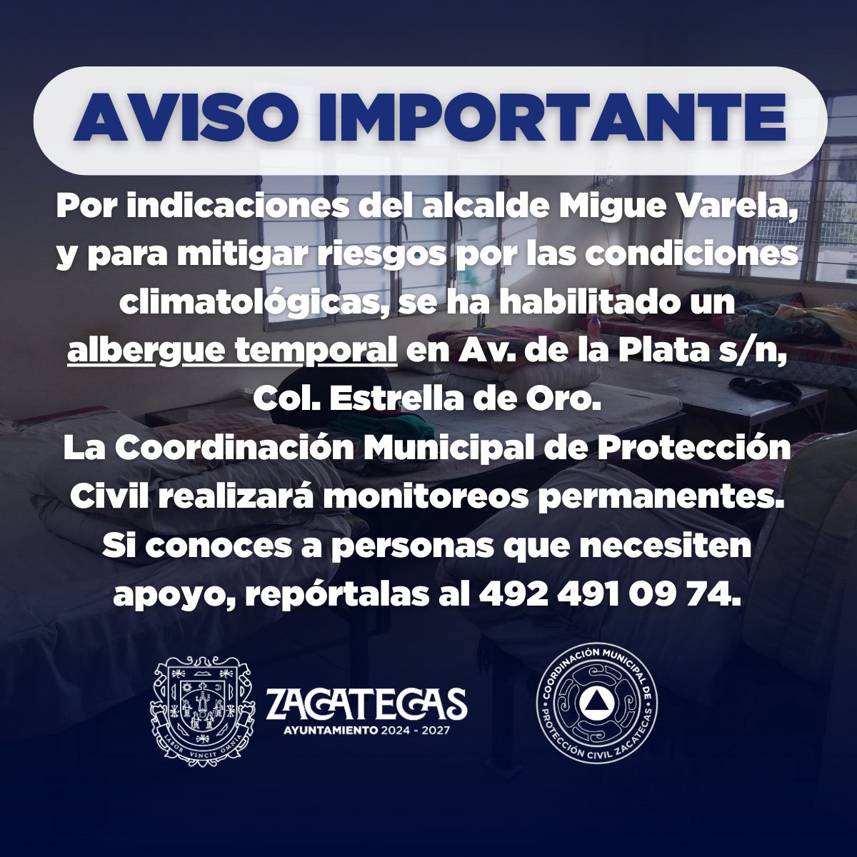Finalmente, Luis Felipe Santos Quintanilla reiteró que el albergue municipal, ubicado en Avenida de la Plata s/n, colonia Estrella de Oro, se encuentra abierto y operando las 24 horas del día. Además, hizo un llamado a la ciudadanía a mantenerse atenta a los comunicados oficiales de Protección Civil, a reportar personas en situación de calle y a sumarse con donaciones de cobijas, ropa y chamarras en buen estado para continuar apoyando a quienes más lo necesitan.
