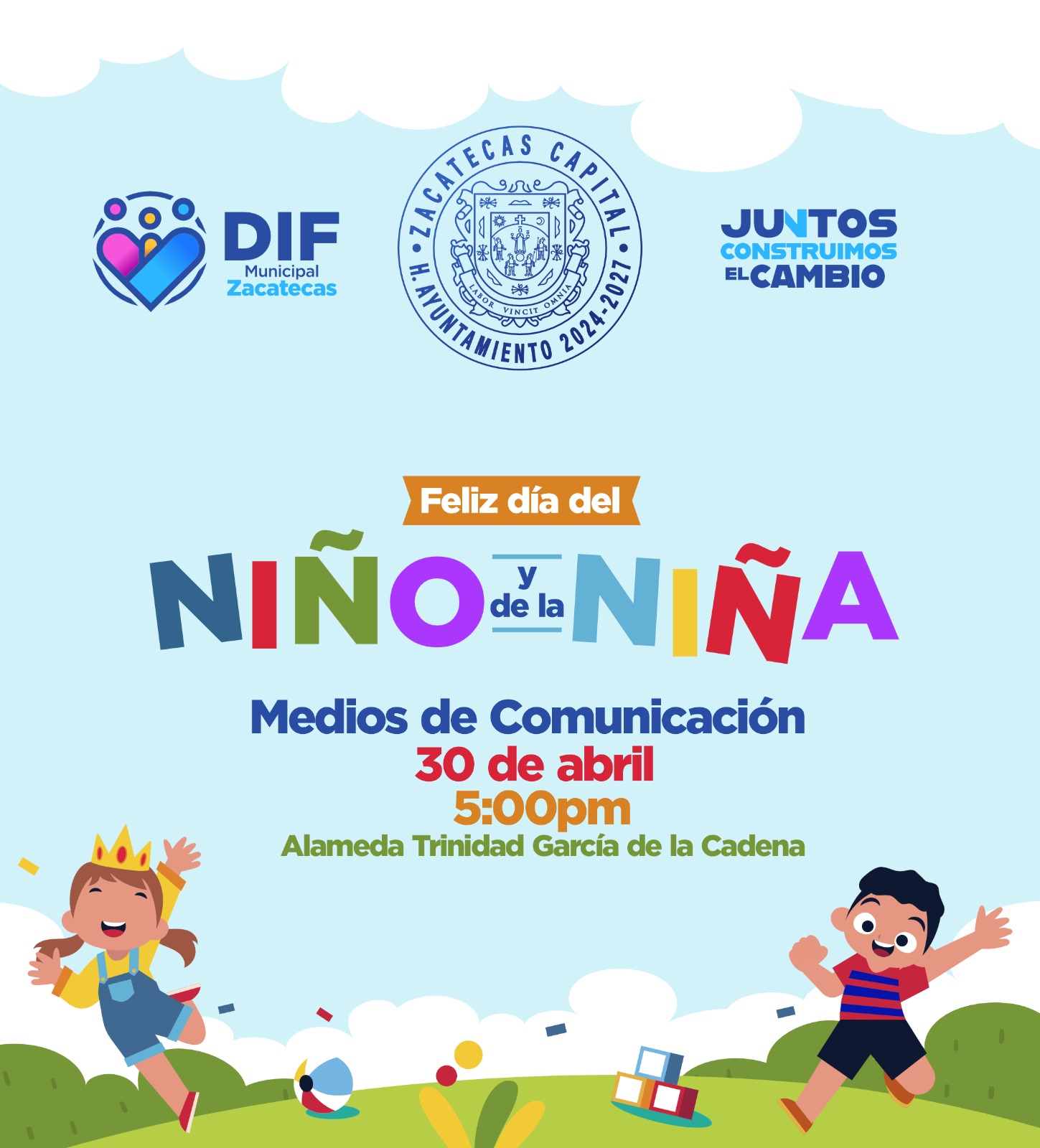 El Ayuntamiento de Zacatecas tiene el honor de invitar a toda la familia a la celebración del Día de la Niñez, que se llevará a cabo este 30 de abril a las 5:00 de la tarde en la Alameda Trinidad García de la Cadena.